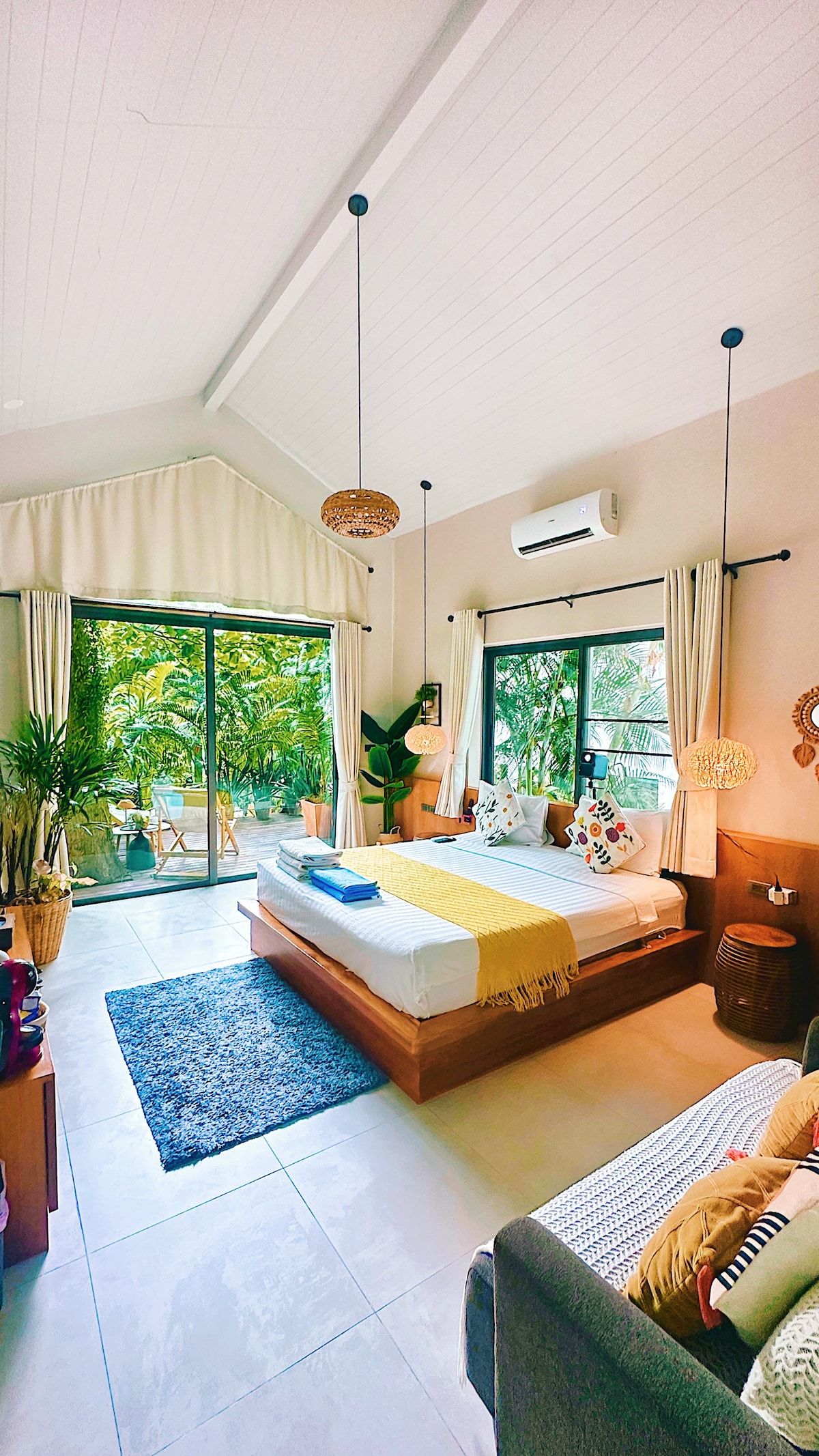 Escape the crowds and stay in a 180 m² private villa where modern comfort meets tropical design. One bedroom with an en-suite bathroom and a dedicated office, plus a huge 90 m² open living space with 4.5 m high ceilings, create a bright and airy home for your stay. Set in a coconut grove, the villa offers a unique sense of calm while still being only a short 3–5 minute scooter ride from the beach, cafés, and main areas. Fast WiFi and a quiet workspace make it perfect for remote work.