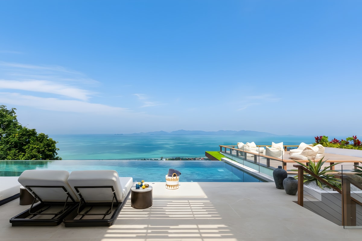 Luxury villa in a gated beachfront estate with 4 bedrooms. Stunning panoramic sea and sunset views from every level. A short WALK to a private beach in Thongson Bay. Ideal for long stays, families and remote work. Premium living features include: •10 m private pool •home cinema with PS5 •gas BBQ •fully equipped kitchen with dishwasher •spacious grounds •3 sea-view workspaces •wellness area with treadmill, massage chair and trampoline •washer–dryer •private parking •huge common beachfront pool