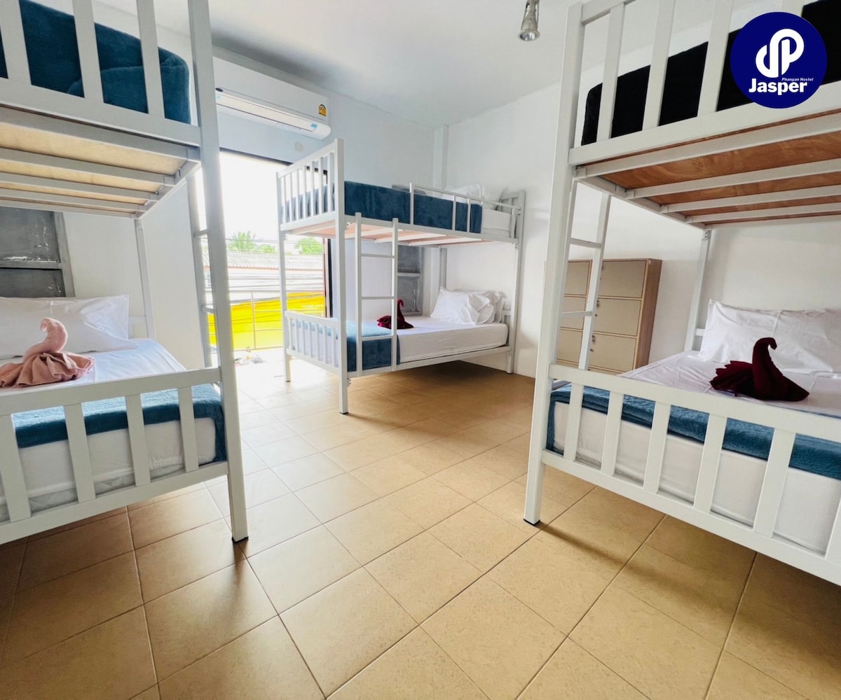 Hostel with shared accommodations in container-style rooms. A total of 12 rooms with 96 beds in total. Each room has 8 bunk beds (2-tier). Shared bathrooms with separate facilities for male and female guests. Laundry and ironing services available for an additional fee. Centrally located on Chaweng Beach, just a 10-minute drive from the airport. Open-air swimming pool available. Private beach area, just a 5-minute walk away from the sea. Cocktail bar (Tiki Box Bar Samui).