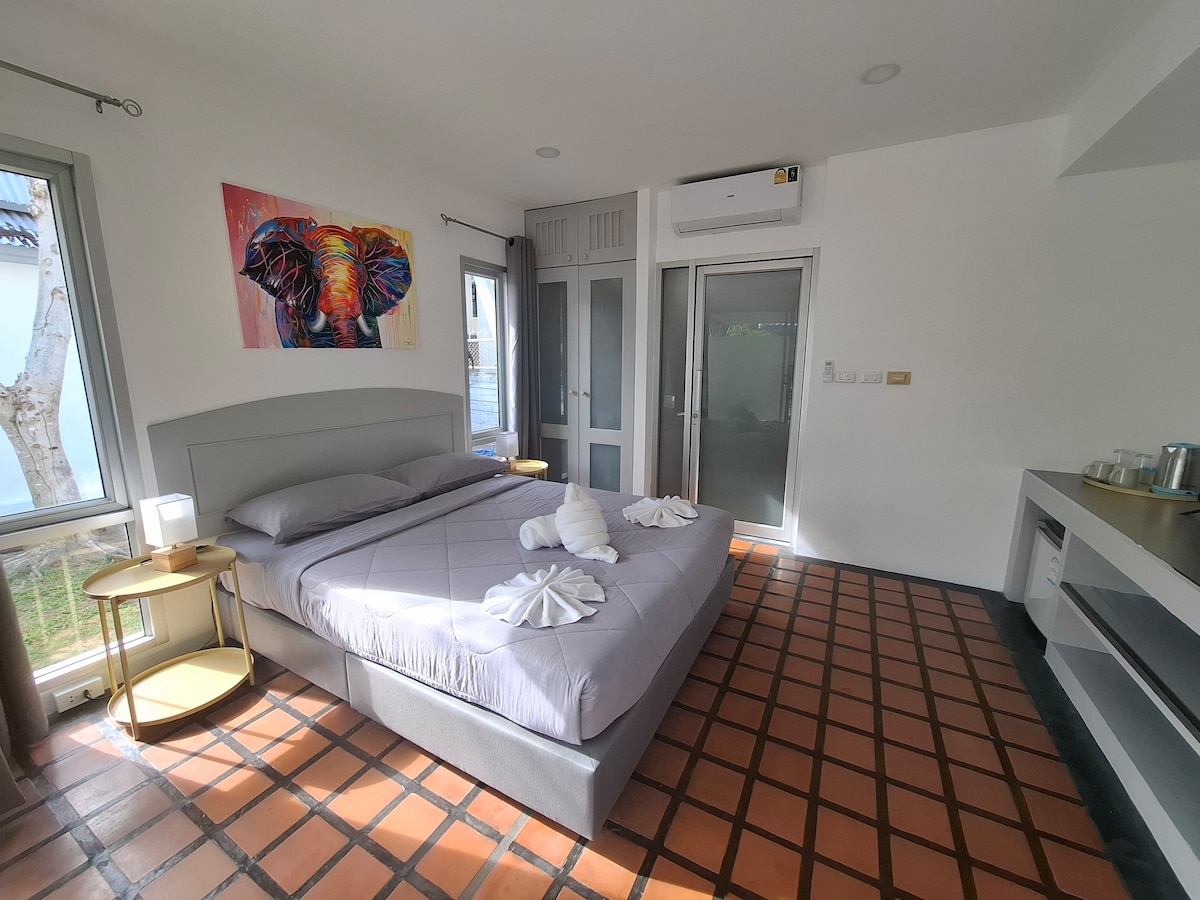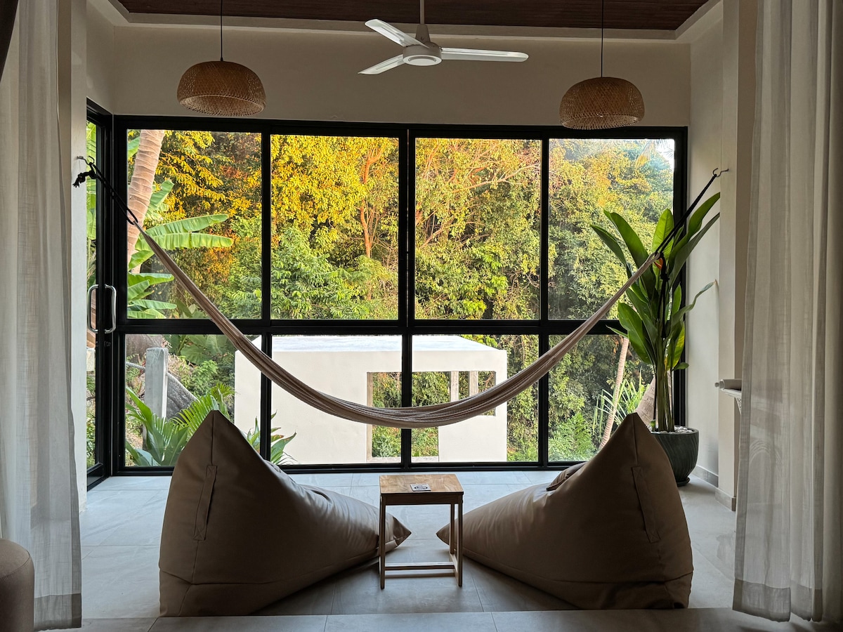 Nestled in lush greenery, this cosy room is perfect for relaxation. Step out to your balcony with a hammock and seating area, ideal for enjoying Thailand’s natural beauty In addition there is a kitchenette area with sink, big refrigerator, hot water kettle and microwave. This area comes with a seating area where you can enjoy your breakfast. This serene space combines comfort and a unique connection to nature.