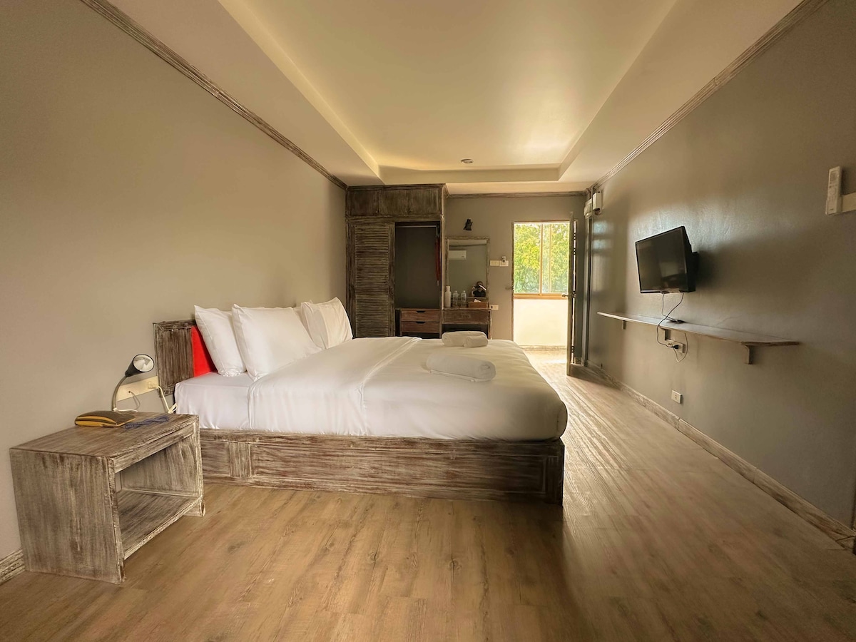 ห้องพักสไตล์บาหลีโคซี่ โดดเด่นด้วยประตูและหน้าต่างทรงโค้งไม้ ให้ความรู้สึกอบอุ่น เป็นส่วนตัว และผ่อนคลาย ตกแต่งด้วยวัสดุไม้แท้ โทนสีธรรมชาติ และแสงไฟวอร์มไลต์ สร้างบรรยากาศเหมาะสำหรับการพักผ่อนอย่างแท้จริง ภายในห้องมีเตียงนอนขนาดใหญ่ ผ้าม่านสีเขียวเข้มสไตล์รีสอร์ต โต๊ะทำงาน/โต๊ะเครื่องแป้ง ทีวี และห้องน้ำในตัว เหมาะสำหรับคู่รัก นักเดินทาง หรือผู้ที่ต้องการพักผ่อนแบบสงบ ๆ ใกล้ Fisherman’s Village เกาะสมุย
