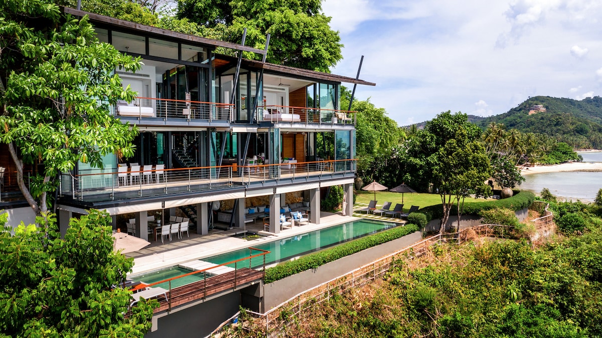 With an earthy color palette and plenty of wide openings to the terrace, Villa Hibiscus makes it easy for fresh ocean breeze and natural sunlight to provide a relaxing ambiance during your beach vacation. Rich wood tones, vaulted ceilings, intricate stone accents, and plenty of tropical greenery display the Koh Samui’s serene architecture, while high-end electronics, designer furniture, and state of the art appliances add a touch of modern luxury to this island oasis.