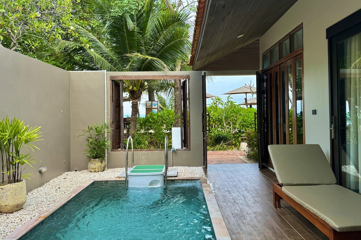 Wake up to stunning sea views in this beautifully appointed beachfront pool villa. Located at the front of the resort, this spacious 92 sqm villa sits just steps from the sand with panoramic views of the beach, turquoise sea, and distant Koh Phangan. Relax in your private dip pool and poolside lounge surrounded by tropical serenity. The villa also features a romantic open-air bathroom with a separate shower.