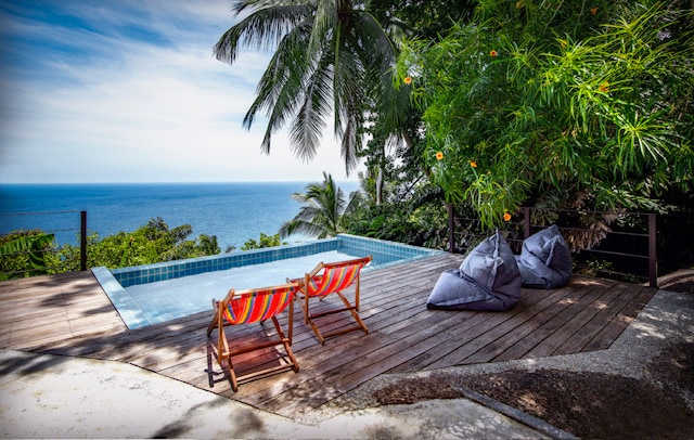 Airy 2 Bedroom Pool Villa in quiet Sairee Beach area with FREE pier transfer. Stroll to the beach! Just 10 min walk to the beach, restaurants, shops and bars this villa is nestled up a small lane with vaulted ceiling, corner sofa, full bathroom & open-plan kitchen. The fastest and most reliable WiFi internet available on Koh Tao. Designed for 5 adults with a maximum capacity of 7. Contact us for larger groups and dissents for children! It has a real tiled roof - only the inside is thatch.