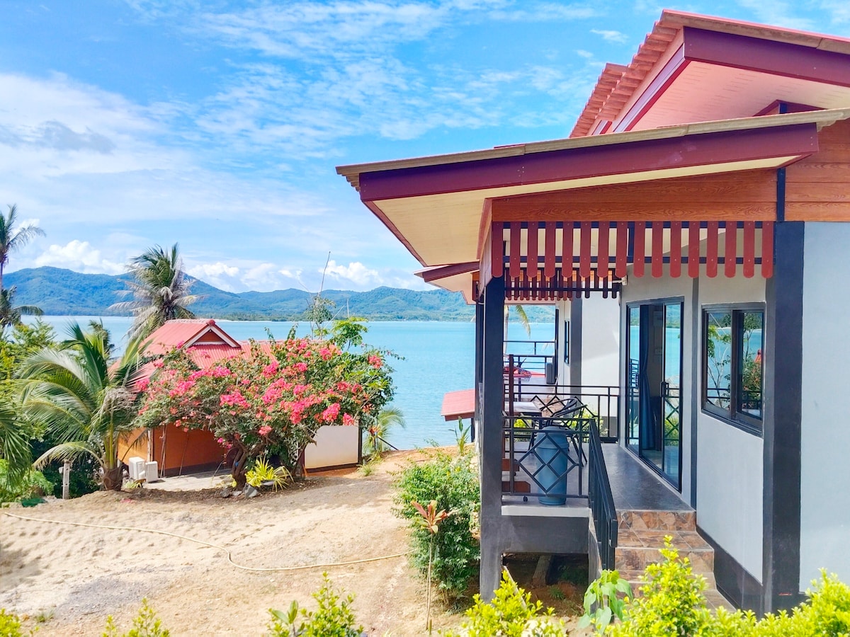 Brand-new bungalow right by the ocean, with a big balcony and AC room with big glass windows with amazing view of the sea.