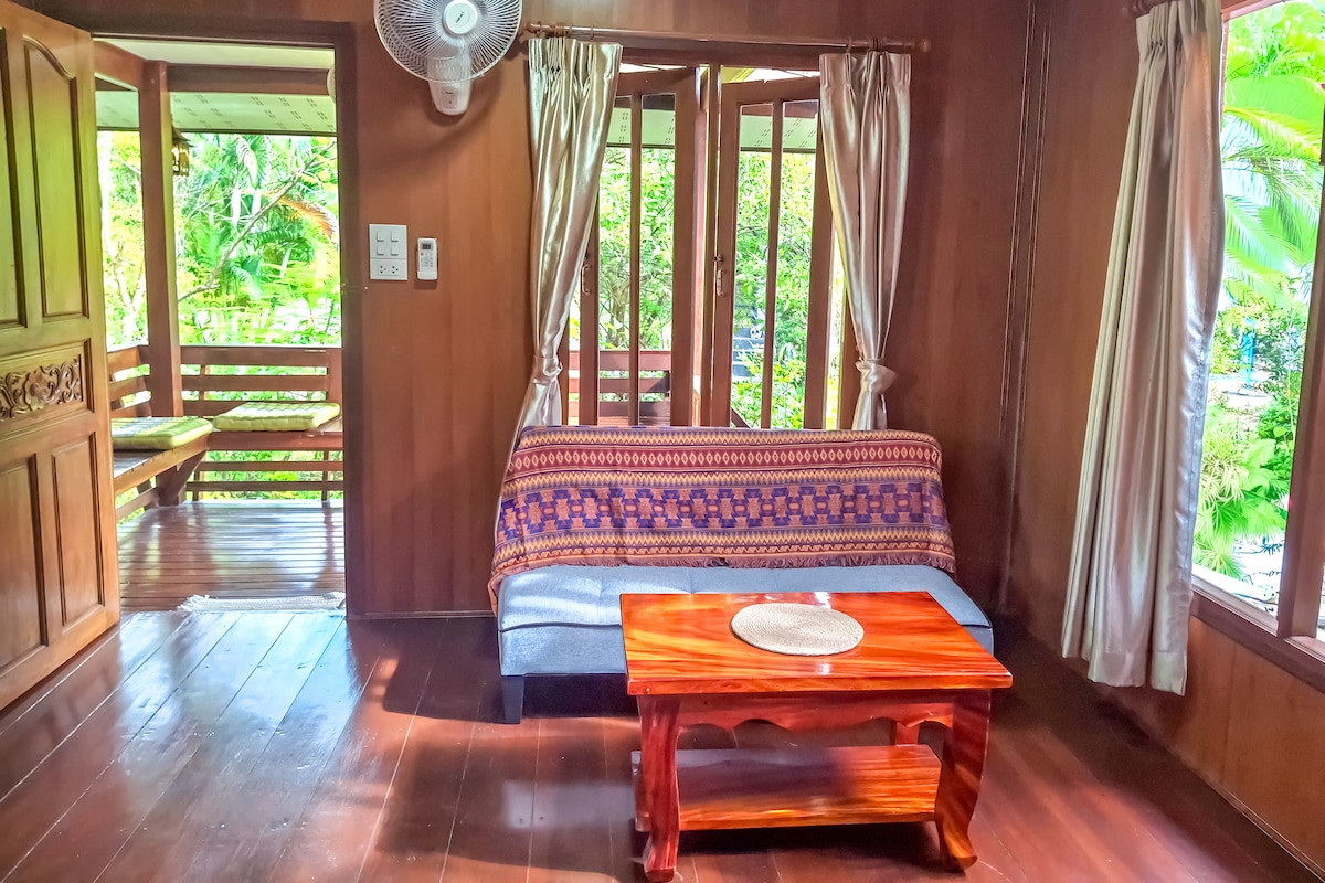 Our funky affordable fan bungalow is surrounded by nature, amongst tropical gardens right next to the sea. You can enjoy the cooling sea breeze and the stunning evening sunset sea views through the thick mangroves trees. Watch the locals go about their day and feel part of the community. You will also enjoy free access to the swimming pool and weights gym at the resort just a couple of hundred meters along the coast.