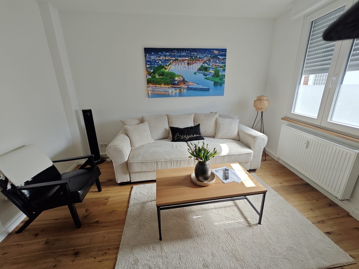 Modern eingerichtete Neubauwohnung mit Balkon und Aufzug im Herzen von Koblenz. Panoramablick auf die Herz-Jesu-Kirche. Am Beginn der Fußgängerzone und 2 Minuten zu Fuß vom Löhrcenter. Die Altstadt, das Schloß und das Deutsche Eck zu Fuß gut erreichbar. Die Wohnung umfasst ein großes Wohnzimmer mit Schlafcouch (Liegefläche 1,20x1,90m), eine Küche, Schlafzimmer mit Boxspringbett (1,80x2,00m), Balkon, Badezimmer mit ebenerdiger Dusche.
