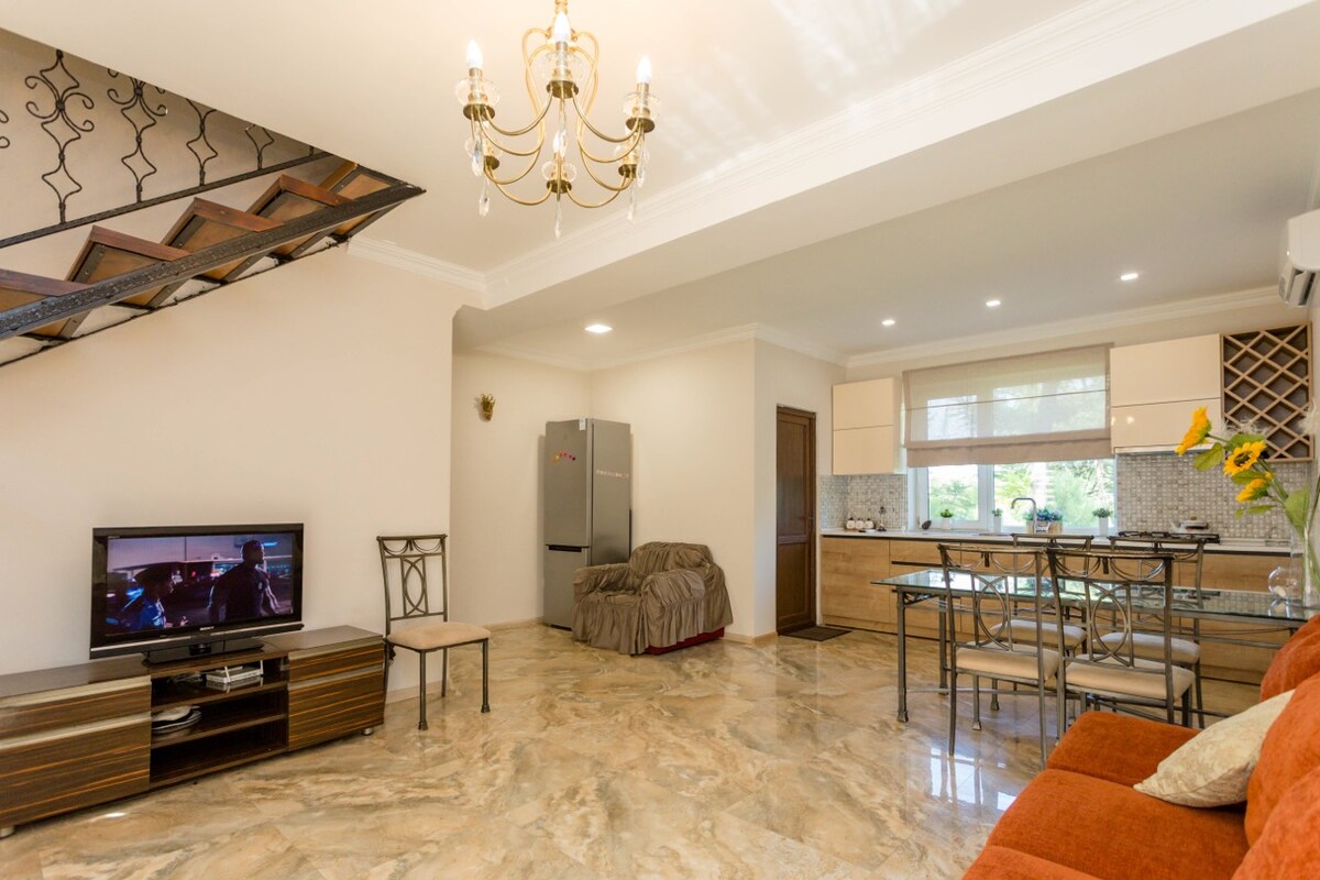 Солнечный, светлый, совершенно новый дом с красивой мебелью. Уютное и тихое место для вашего отдыха. В доме есть все, что может понадобиться для комфортного проживания: Wi-Fi, Кондиционер, Телевизор, Стиральная машинка, Сушилка, Кухонная посуда Также вы найдёте предметы личной гигиены: полотенца, мыло, фен, утюг и тд Спокойствие, чистота окружающей природы и наше гостеприимство сделают Ваше пребывание в Батуми максимально приятным и запоминающимся! Трансфер с аэропорта или вокзала - бесплатно.
