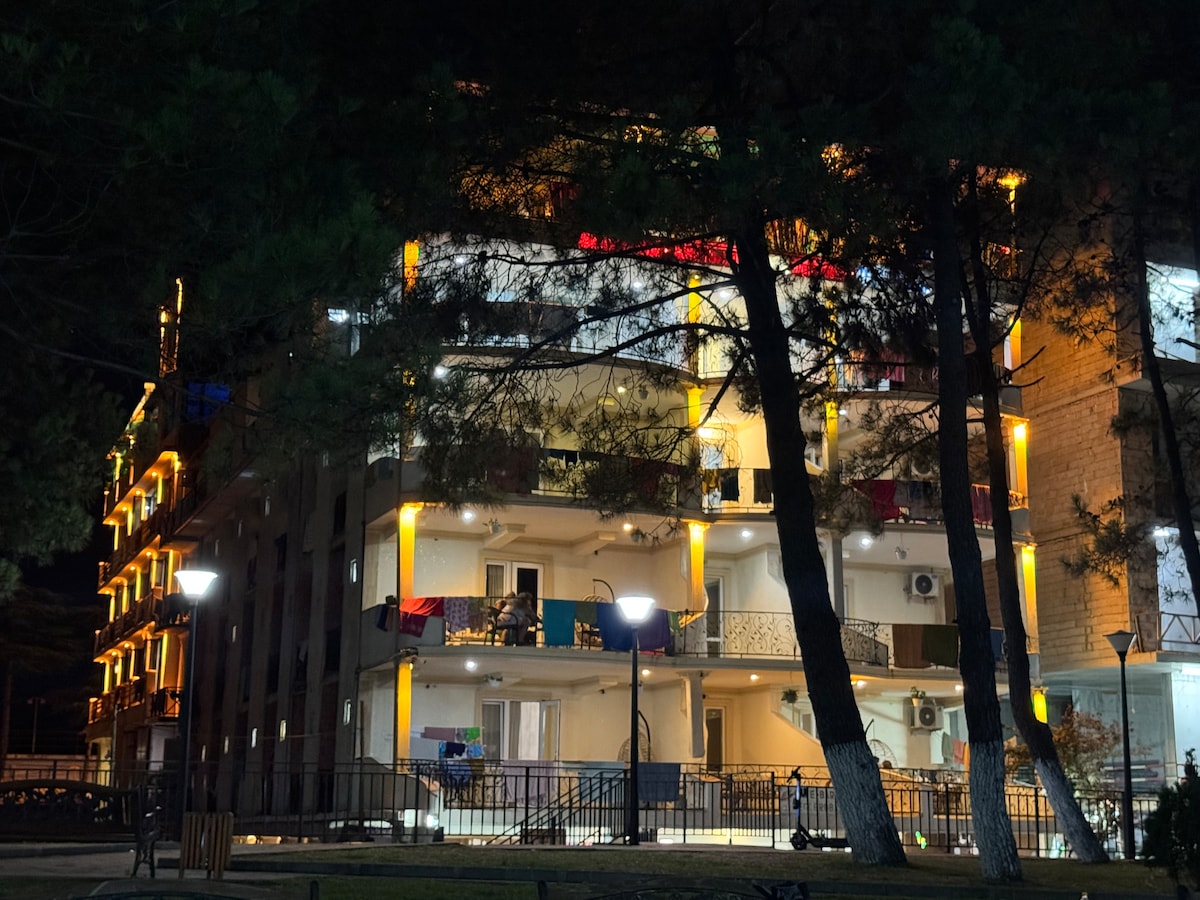 Новый апарт-отель (постройка 2020 года) в тихом районе частных домов Кобулети. Расположен в 150 метрах от береговой линии. Широкий пляж из мелкой гальки,удобный для вашего отдыха. Между нашим отелем и пляжем находиться кафе-терраса с домашней грузинской и европейской кухней (по Вашему желанию),цены демократичные. В отеле есть отдельная комната с стиральной машиной и сушка для белья. В отеле Вас встретит хозяйка - Софо,которая поможет решить любые проблемы возникшие во время вашего проживания.