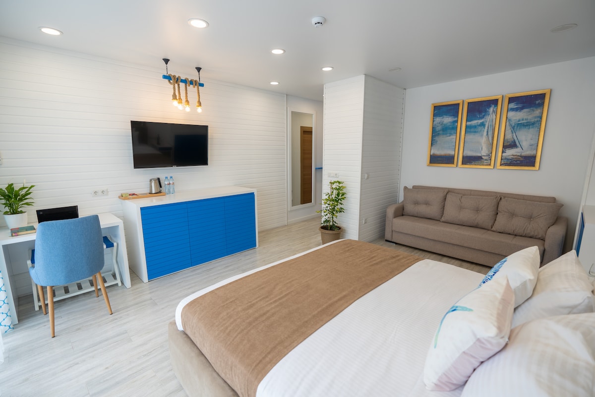 Modern spacious premium studio on the 17th floor with stunning views of the sea, park, mountains and pool. The apartment has everything you need for a comfortable stay: dishwasher, capsule coffee maker, washing machine, toaster, microwave, etc. The apartment is located in the best complex in Batumi with a large territory, swimming pool, sports and playground in the courtyard, restaurants and a shop. Near the shopping center, casino, sea and park. The airport is 5 minutes away by taxi.