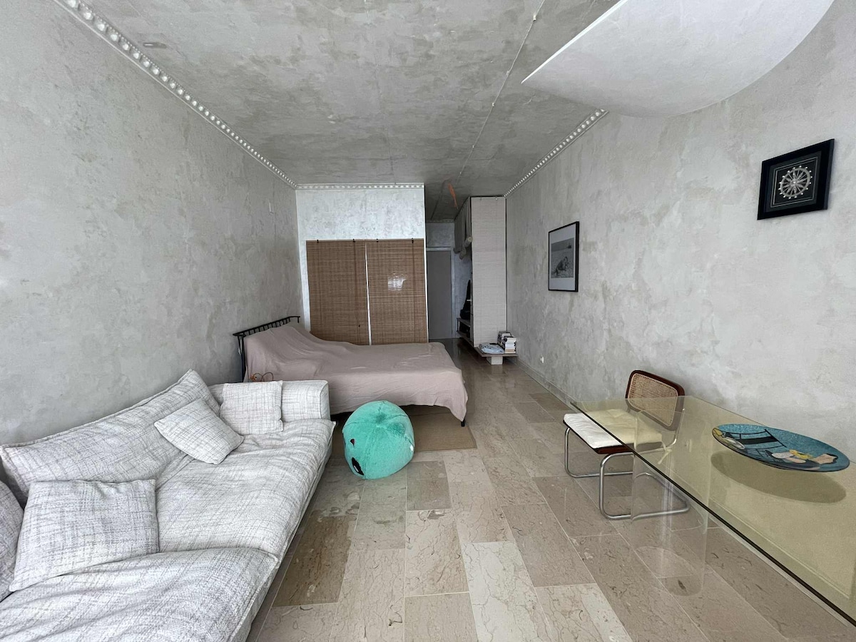 This fashionable beach studio is calm and sun-washed, with textured plaster walls that quietly mirror the colors of the sea outside. the space is relaxed and unfussy with minimal pieces of a glass dining table, woven chairs, and restrained artworks. The view of the sea from the apartment and its terrace stretches endlessly under soft sunrise and sunset skies. The muted palette of washed neutrals allows the view to remain the star, making the studio feel serene, airy.