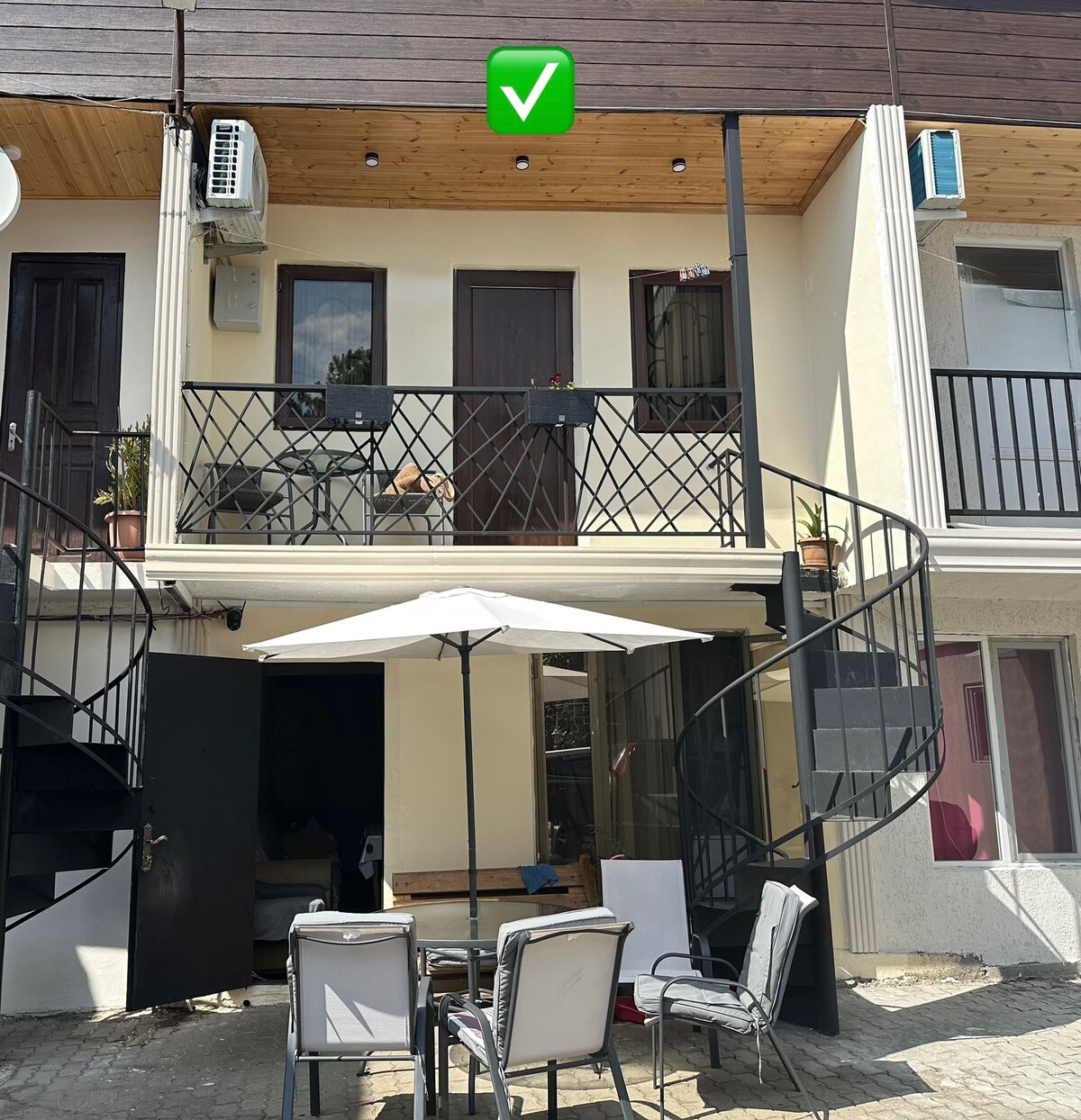 Прекрасный дом,недалеко от моря, всего в 250 метрах! На небольшом взгорье, с чудесным видом на море и постоянным свежим морским бризом. В вашем распоряжении весь второй этаж с отдельным входом,тремя спальнями, огромным залом,кухней санузлом и балконом. С каждой спальни открывается панорамный вид на море. Во всех спальнях по две удобные кровати, с возможностью добавить еще по одной кровати. + в зале уголок раскладывается и превращается в кровать для двоих! и смарт телевизор с плоским экраном.