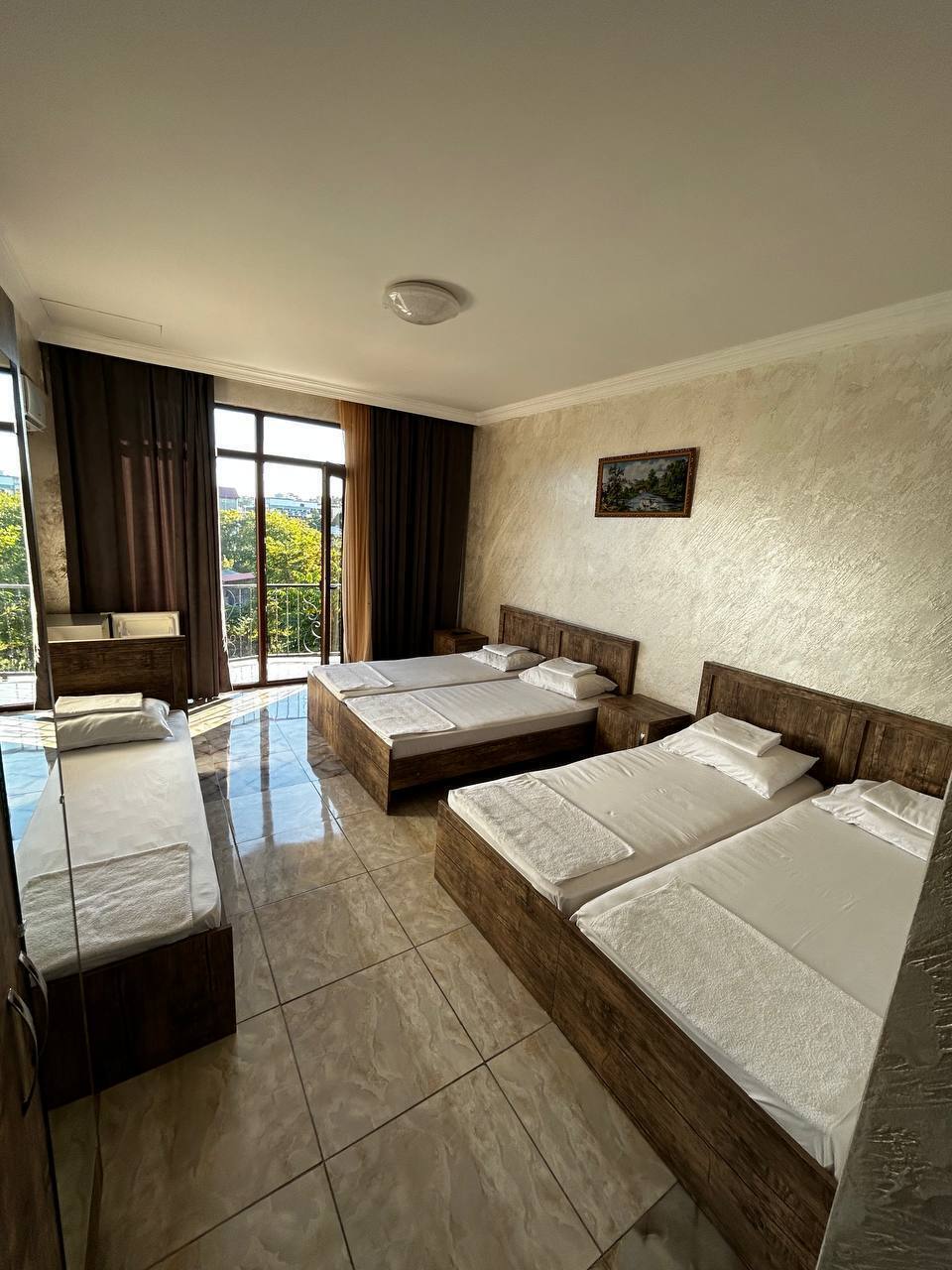 В 120 метрах от моря, в туристическом центре Кобулети и одновременно чуть удаленном от дороги, в окружении зелени, новый дом гостиничного типа предлагает уют и просторные номера с большими террасами и санузлами, с кухней и бытовой техникой. Ждем вас!