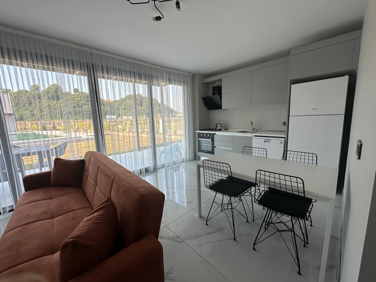 Stay in our stylish and spacious 3-bedroom, 3-bathroom ground-floor apartment near Izmit. With a large private patio, 55-inch Smart TV, free WiFi, and a fully equipped laundry room, every detail is stylishly designed for your comfort. The beautiful district of Kocaeli offers peaceful retreats with parks, trails, and scenic views. We are conveniently located: 1.5 hours from Istanbul Airport 45 minutes from Sabiha Gökçen Airport 15 minutes from downtown Izmit 30 minutes from Sapanca