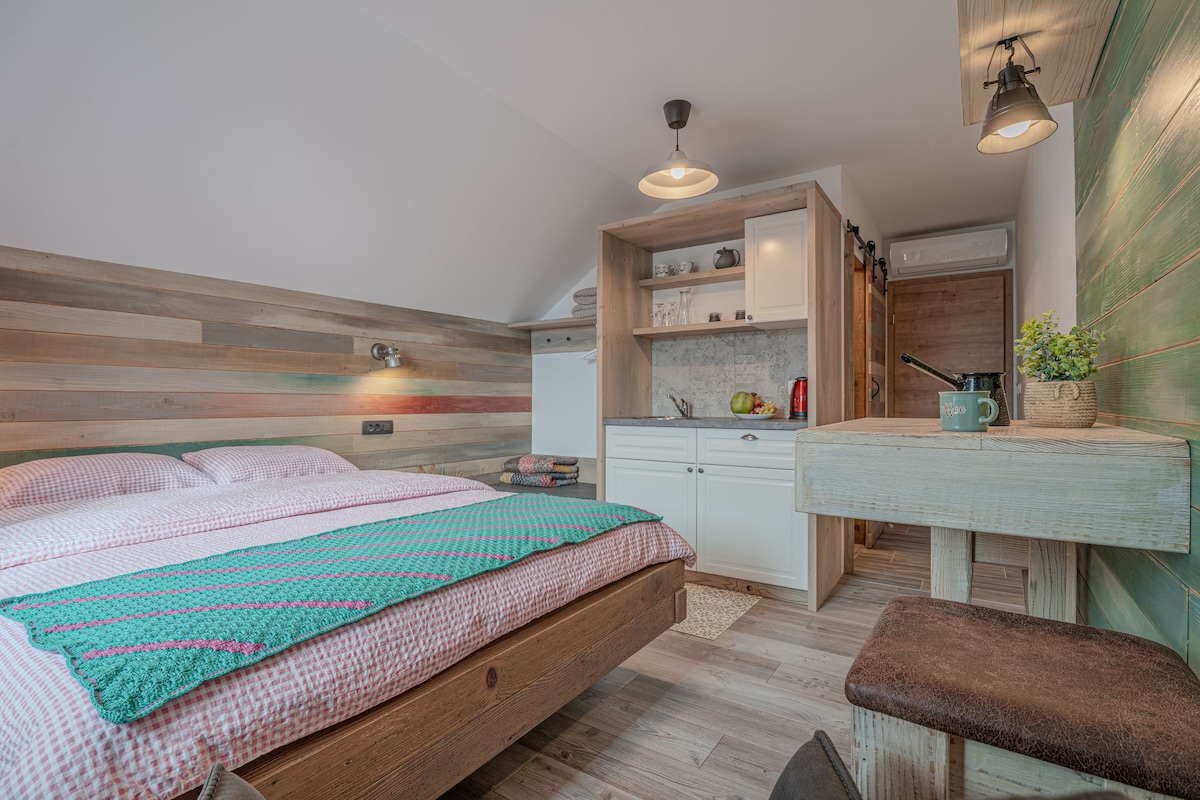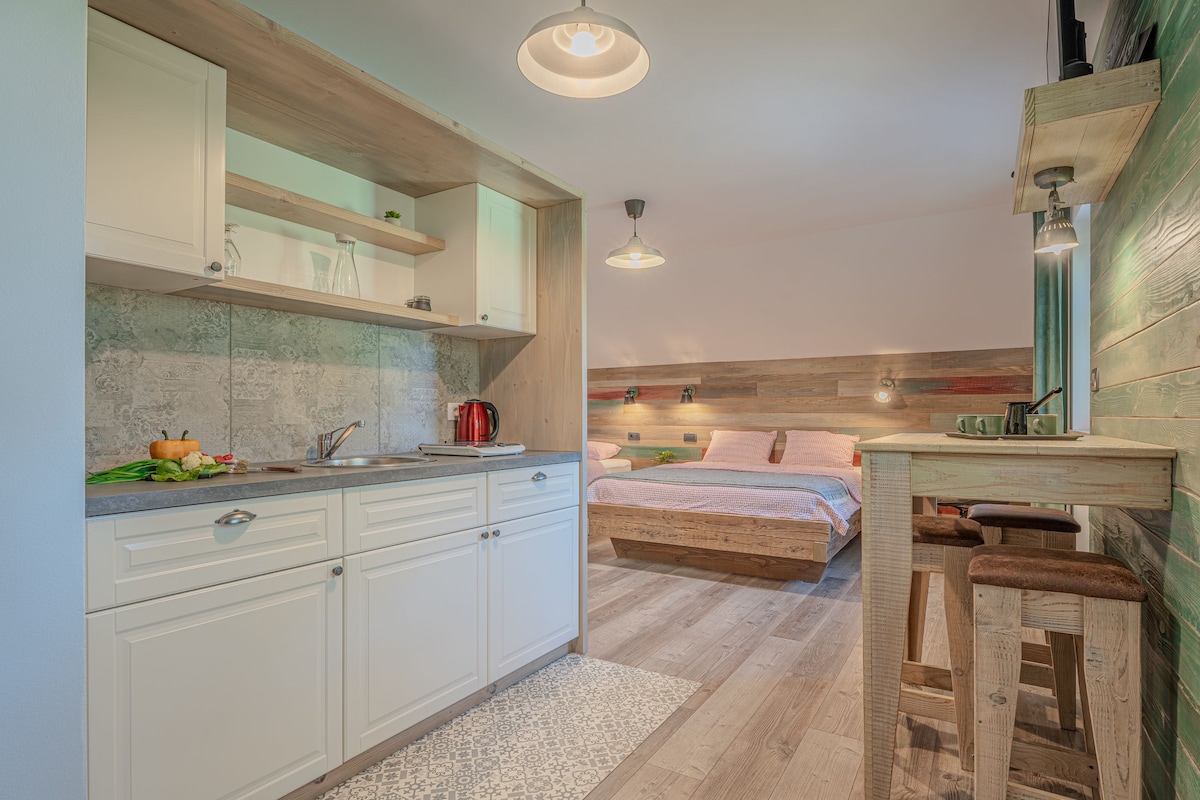 Modern studio apartments next to Lukčeva Domačija offer comfort, privacy, and a close connection to nature. With bright spaces, a fully equipped kitchen, a cozy bed, and a clean, modern design, they’re perfect for couples or solo travelers. Just steps from the traditional homestead, the apartments offer peaceful stays with a warm, authentic countryside feel – ideal for relaxation or remote work.