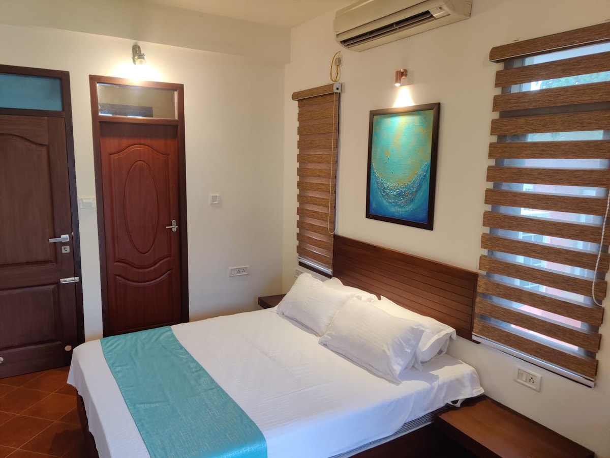 Discover our secluded AC Deluxe Double Room on a private, dedicated floor at Mango Tree Villa. This luxurious room offers a tranquil retreat with exclusive access, surrounded by lush greenery. Enjoy modern amenities and elegant furnishings, all set against a serene, green backdrop. Perfect for a peaceful escape, this room combines privacy and natural beauty for an unforgettable stay. Book your private haven now at Mango Tree Villa.