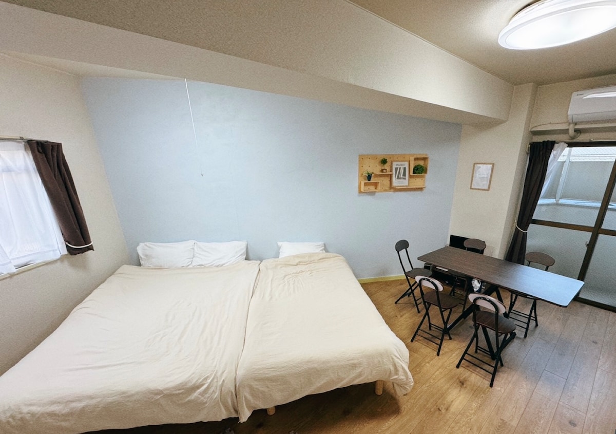 道後公園すぐそばの静かな6畳和室です。 コンパクトな空間ですが、日本らしさを感じられる“和”の雰囲気と、のんびりとした滞在時間をお楽しみいただけます。 ・最大4名様までご宿泊可能 敷布団はシングルサイズを3枚ご用意しており、横に並べると約300cm(ダブルベッド2台分以上)の広さになります。 掛け布団は4枚、枕も4つございますので、大人4名様でもご利用いただけます。 ご家族での“川の字”スタイルや、ご友人同士での思い出作りに、日本ならではの布団体験をお楽しみください。 ・ローテーブルと座布団で、くつろぎながらの団らんに最適 ・徒歩すぐの「道後公園」での朝の散歩や夕方のひと休みにぴったり ・道後温泉本館や商店街へもアクセス良好 ・新品のキッチン付きで、簡単な自炊も可能 ・徒歩5分圏内にスーパーマーケットとコンビニがあり、買い物にも便利です ・Wi-Fi完備でリモートワークや長期滞在にも対応 ・観光だけでなく、"日本の暮らし"を感じられるシンプルで落ち着いた滞在をご提供します