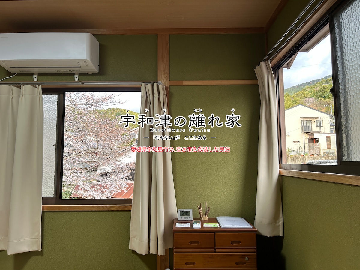 山あいの小川沿いの静かな宿泊先です。川のせせらぎ、鳥の鳴き声、木々を渡る風の音……心地よい静けさを味わいながら、ゆっくりと滞在して頂くことができます。 旅の疲れを癒し、日々の忙しさを忘れて、のんびりと過ごしてみるのはいかがでしょう。 *敷地内に駐車スペースはありません。 *最寄りのコンビニは、やや離れています。 *ホストが1階に滞在します。 *簡単な朝食付きです(パンとシリアル) ―― 「何もない」が ここにある ―― 有名ではないですが、近くには味のある寺社が点在しています。観光客も少なく、落ち着いて散策を楽しむことができます。 また、市街観光地へのアクセスも比較的良好です。 <近隣スポットへのアクセス> ・コンビニ(ファミマ):徒歩15分 ・スーパー(フジ桜町店):徒歩25分 ・飲食店街:徒歩25分程度 ・JR宇和島駅:徒歩25分 ・宇和島バスセンター:徒歩25分