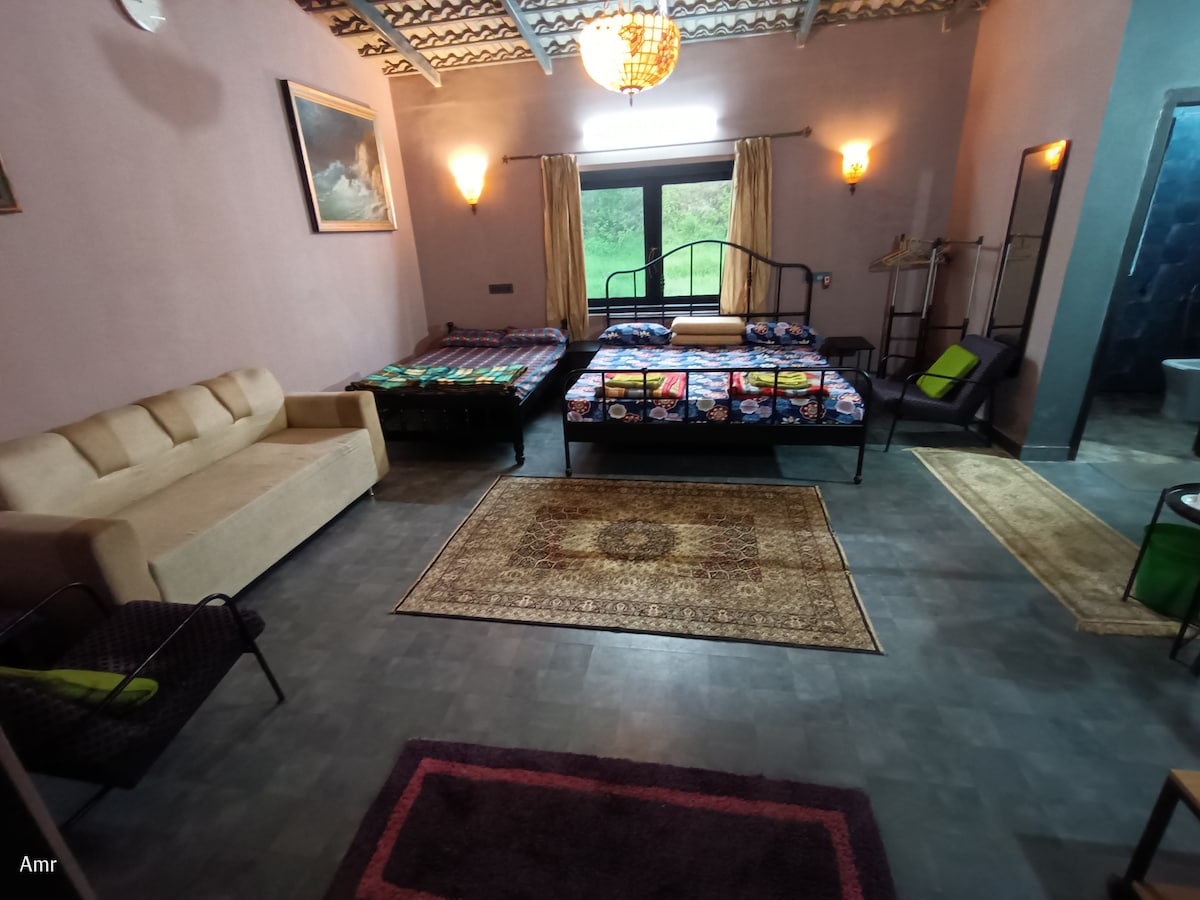 Wild River Cottage, Garvale village, Madapura, somwarpet taluk, Coorg, karnataka. Wake up to scintillating birds and peacocks calling. Swimmable river-facing two side-by-side cottages in the heart of nature with complete peace and tranquility away from hustle and bustle in a 2-acre-wide property. Breakfast included. Room price for two people per night. Additional person 1500 payable, including children. Pet 500 per night with 2 meals. Large 25 sq meters bedroom. Attached bathroom with geyzer.