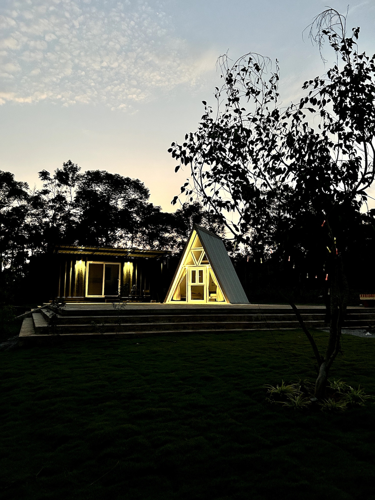 Find rustic charm in our A-frame cabin, nestled amidst nature's embrace. Embrace the cozy retreat with glass doors that invite the outdoors in. Enjoy the intimate ambiance of two separate beds and an attached toilet/bathroom. Unwind on the platform surrounded by lush coffee estate. Seamlessly blending modern comforts with classic design, this cabin offers a tranquil escape for nature lovers seeking a stylish yet serene getaway—your escape to simplicity begins here.