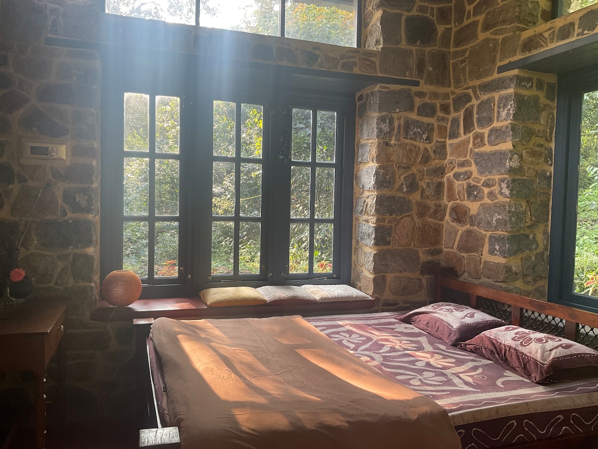 The Artist is our smallest and cosiest cottage, ideal for up to 2 guests. It is surrounded by eucalyptus trees and a few steps away from the stream which runs through the farm. All cottages and the common dining room have wifi, 24/7 hot water and power back up. We are accessible by car and there is parking on the farm. Home style veg and non-veg meals are offered on the farm: Breakfast - Rs. 250 per head Lunch - Rs. 300 per head Dinner - Rs. 400 per head.