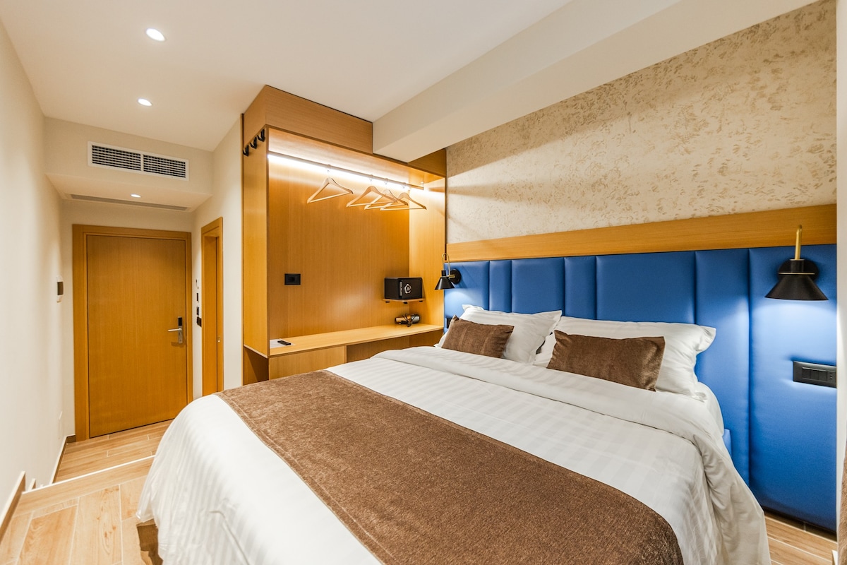 Stylish studio in the center of Durres, perfect for two. Features a comfortable double bed, elegant lighting, and modern décor. The bathroom is spacious, with terrazzo tiles, a walk-in shower, and illuminated mirror. Enjoy quiet rest with blackout curtains and a peaceful setting. Located near shops, cafés, and just minutes from the beach. Ideal for couples or solo travelers seeking comfort and design in a central location.
