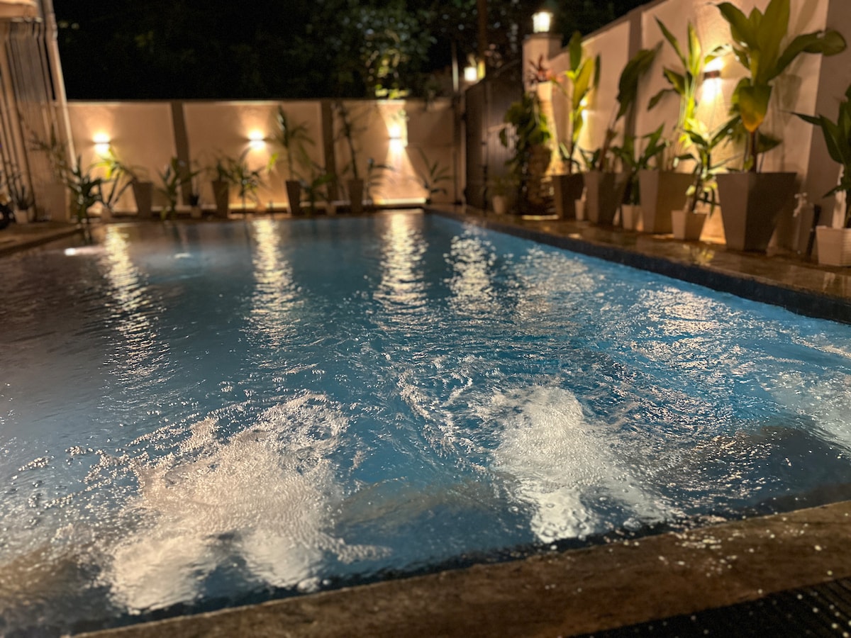 This is a first floor apartment on the right side, part of a two-bedroom apartment. The room comes with an attached bathroom featuring hot water and is equipped with air conditioning. You’ll have access to a shared kitchen and living area, complete with all kitchen essentials and a washing machine. Outside, you can enjoy a beautiful green garden with a swimming pool, where you can see birds and monkeys. It’s a quiet and relaxing place, just a 7mins walk to the famous Hikkaduwa surfing beach.