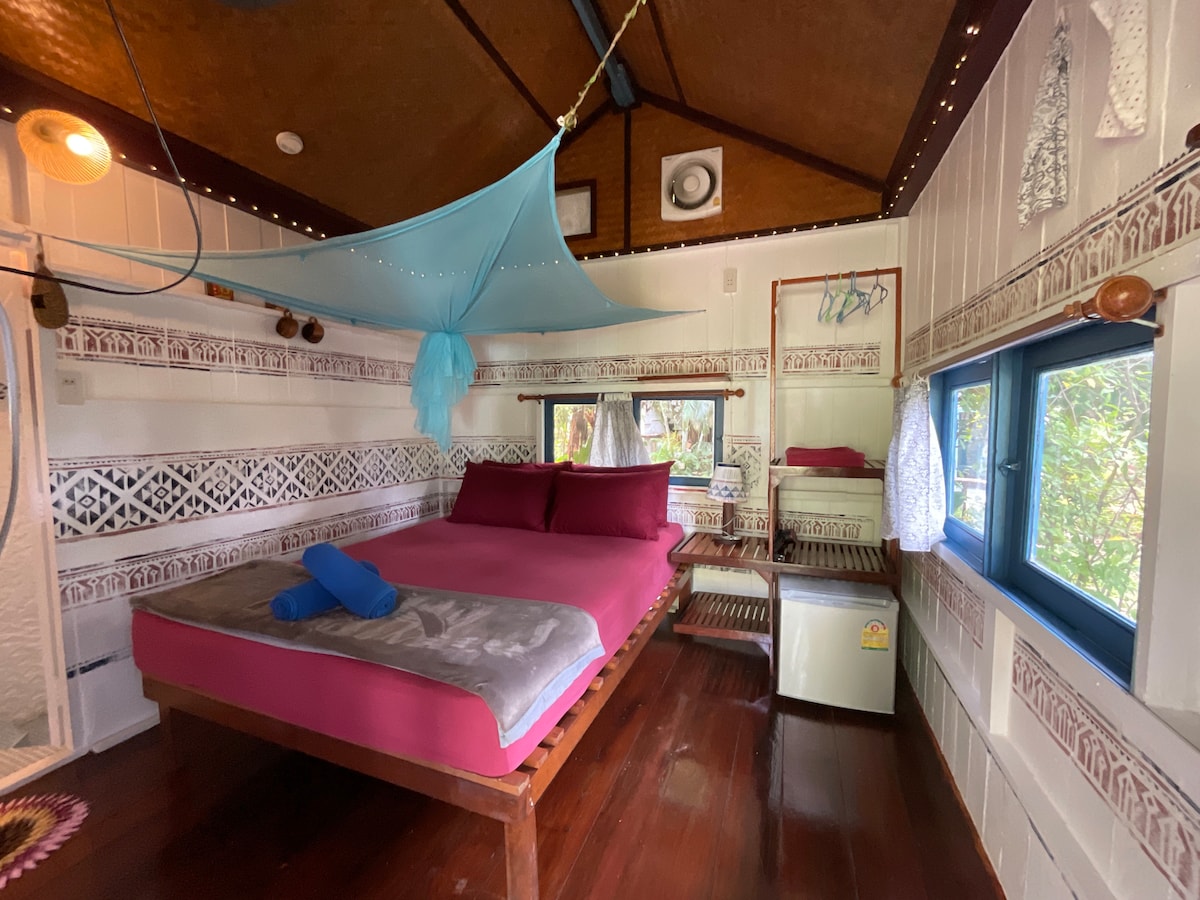 Comfortable bungalow located in a quiet resort, in a garden in Klong Prao, 200m away from the beach and 200m away from the main road. Air-condition, fridge, private bathroom with hot shower, good WiFi, TV with Netflix. Our guests have access to a shared equipped kitchen outside our reception. Cleaning on demand for free.