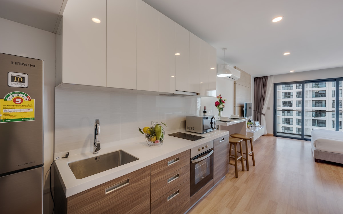 Enjoy a luxurious stay in our beautifully redesigned condo with top-notch appliances (65-inch smart TV, full kitchen, fridge, washer, smart AC, Japanese toilet…) with quality mattress and sofa. Perfect for family🥰, biz execs 💻 or lovely couples. ❤️Full amenities and services: Biz lounge, meeting room, golf simulator, Sky bar, pool, gym, coffee shop and kids playground. Extra beds available for more than 3 guests. We always keep making our house better!