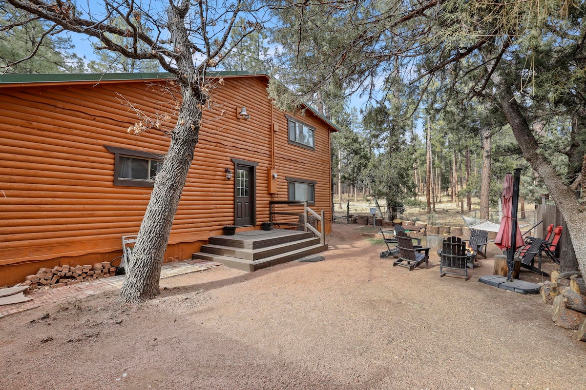 Come spend time in the Pines with the whole family or intimate setting for 2. Amazing 2 bedroom cabin with a deep woods feel, but just a mile from downtown Pine. MBR has a super comfy posturepedic king size bed & 50” HD Roku TV. 2nd bdrm has full bed with comfy topper, a work space, printer, and 42” HD TV. LR has wood burning FP, 4 bar stools & a large 64” HD TV with sound bar. Kitchen has all you need to whip up fav meals. Outdoor space galore with gas BBQ, dining, seating for all.