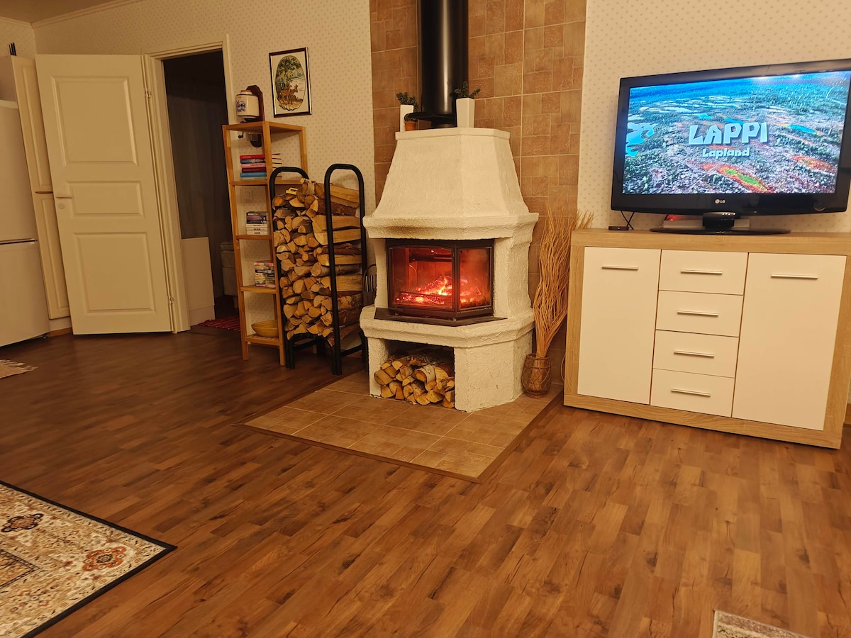 Renovated semi-detached house (2br, 67sqm) in a quiet location, 5 km from Ruka. 500 m to the cross-country skiing track, 100 m to the snowmobile trail, and 4 km to the grocery store. The apartment is great for families or a group of friends. The floor plan is such that the smaller bedroom and the separate toilet are separated from the rest of the apartment by a door, so privacy is available. A nice atmosphere is created by an open fireplace, sauna, a terrace, and a forest landscape as a bonus.