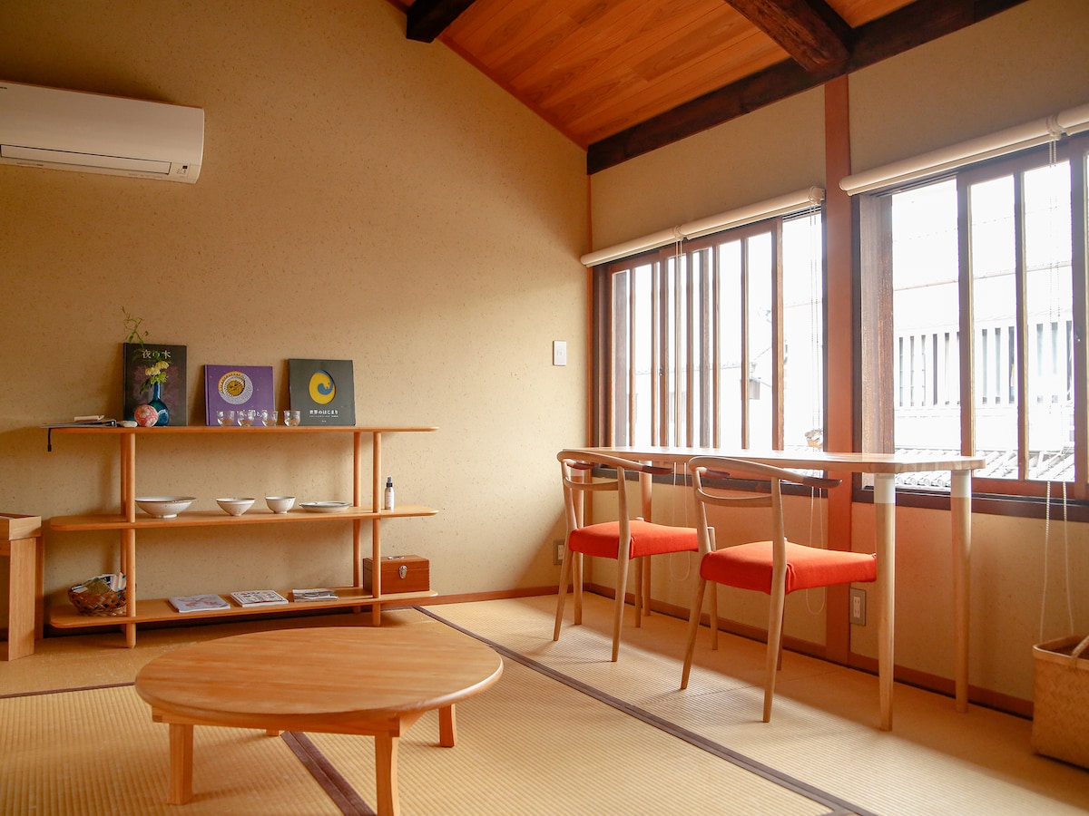 Restored historical 100+ year old Traditional Japanese style home. 20% discount offered on multiple day stays. All 3 bedrooms are tatami mat with Futon bedding. 1 BR on the 1st fl. with a garden view that historically, had been used as a waiting place for tea ceremony guests. There is a kitchen/dining area and a full-Bath with western amenities and use of a washing machine on the 1st fl. The 2nd Floor provides 2 adjoining BR separated by shoji screen doors and also includes a half-bath.