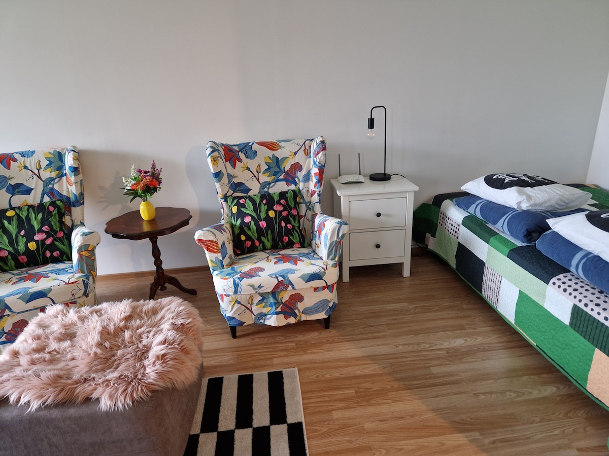 Take it easy at this unique getaway and enjoy your stay in this fairly new 34 m2 condo & studio (+13 m2 balcony). Calm neighborhood with excellent transportation connections makes accommodation comfortable and makes you feel like home. The bus stops are located right near near the apartment and the metro station is only a 5-minute walk away (450 meters from the apartment) which takes you to the city center within 12 minutes.