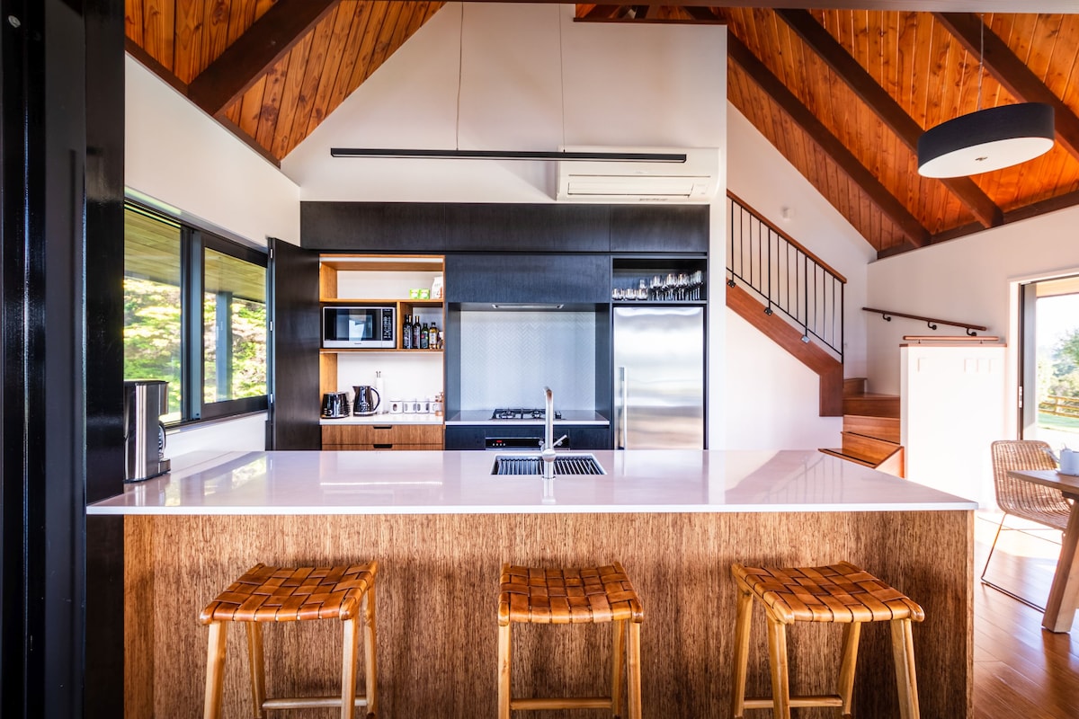 Luxurious Eco House in Rural Paradise Experience modern eco-living with a rustic touch in our off-grid, private retreat. Newly built and self-contained, this haven offers stunning valley and ocean views, making it perfect for relaxation and unwinding. Enjoy the tranquility and beauty of nature in this unique and comfortable getaway.
