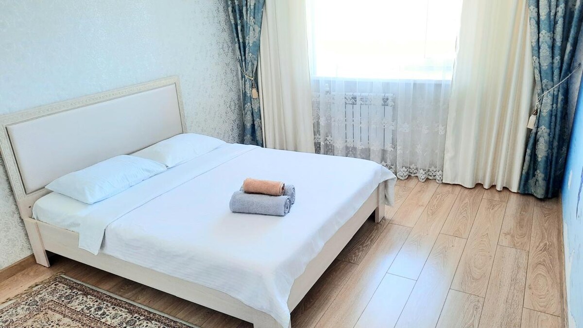 Квартира расположена в удобном районе города, в новом доме. К услугам гостей бесплатный Wi-Fi. В числе удобств полностью оборудованная кухня, ванная комната, спальня. В апартаментах установлены стиральная машина, большой смарт-телевизор. В ближайшей доступности продуктовые магазины Кристалл, Лайм, спортивный комплекс Бурабай.
