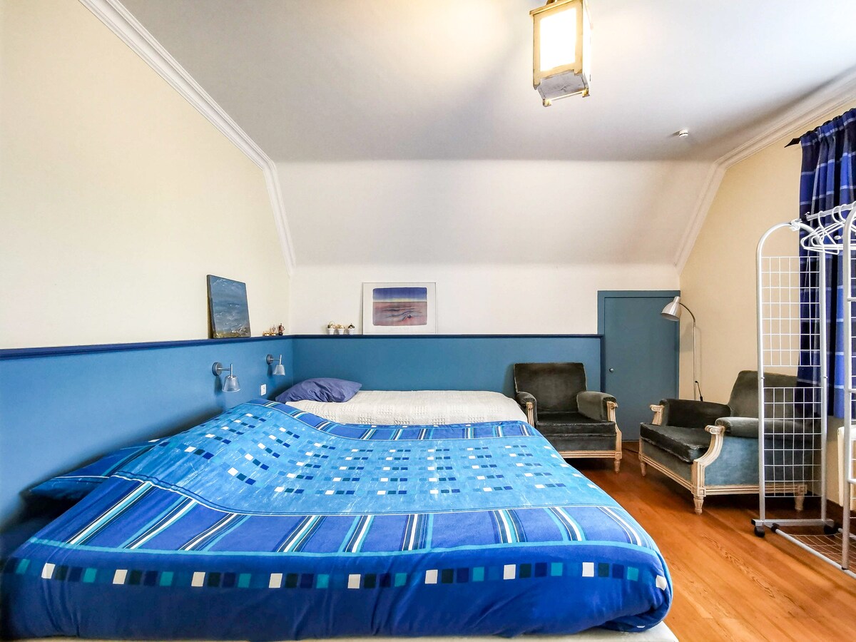 Dans le haut de France à Dunkerque sur la commune de Leffrinckoucke, jolie maison de 250m2 avec jardin que vous partagerez avec nous et notre petit chien. Bienvenue chez nous soleil ou pluie vous serez obligé de venir plusieurs fois il y a tant de choses à faire la liste est trop longue ! Nous sommes discrets tout en restant à votre écoute. Votre chambre de 30m2 située au 1er étage dispose d'un salon, salle de bain et télévision. Le petit déjeuner est en supplément .