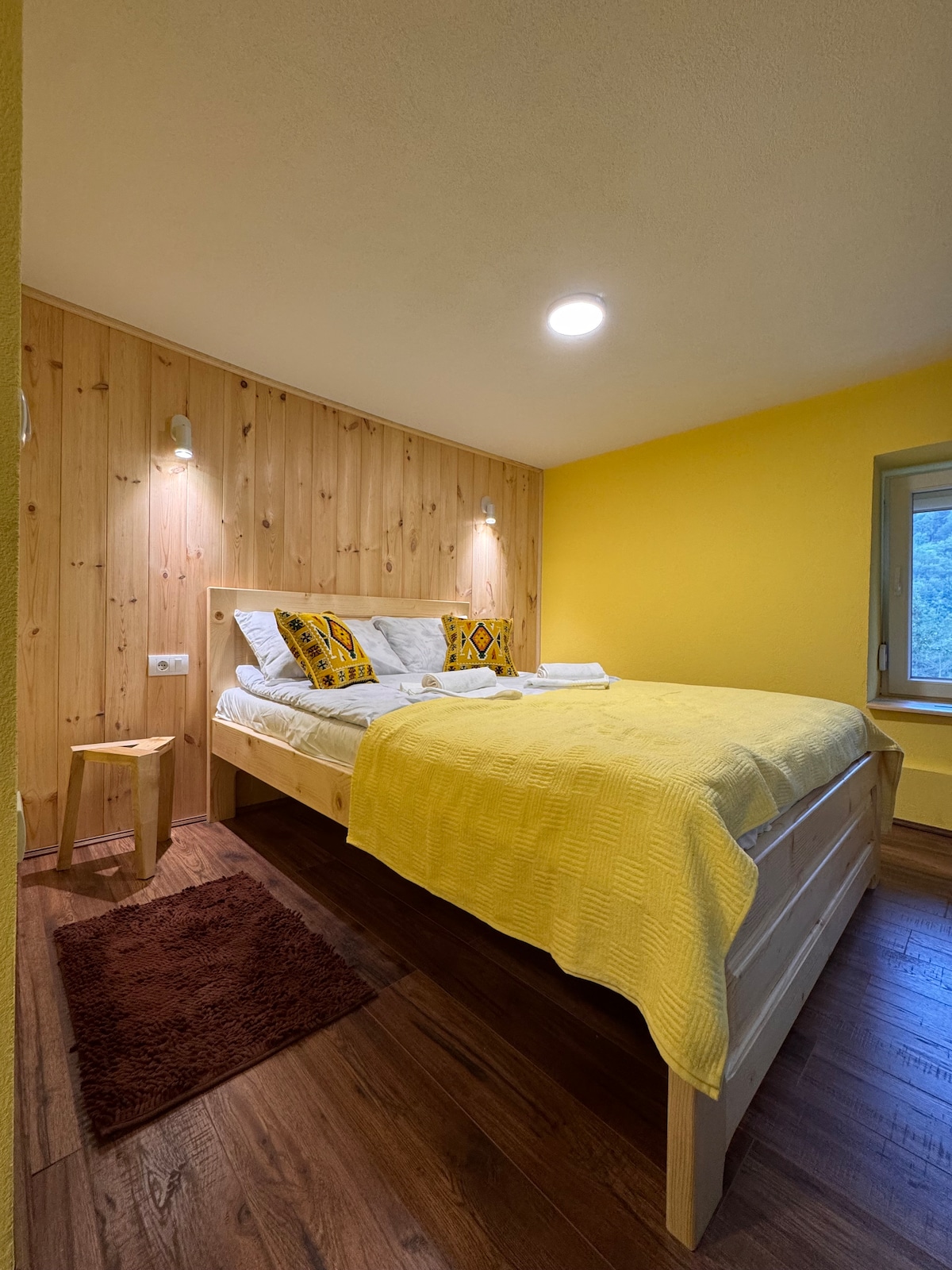 Unique attractive design concept mushroom like. Modern and cozy apartment for three, situated up on a hill, above log cabin with nice view on mountain peaks and river Tara valley. Near the mushroom guests may enjoy barbecueing or makeing log fire. The mushroom is ideal for honeymooners or younger people or for tourists looking for something different and unusuall. Innerspace is divided in two leveles (ground floor + upper floor) and suitable for two (+ one) persons. Ground floor has open space entry hallway with bathroom and living/dinning room with kitchenette (basic electrical suppliences and pottery). The ground floor is conected with upper floor by quite steep stairs (not preferable for elderly persons or persons with disabilities). Upper floor is divided in two zones: lounge and sleeping area. Sleeping area has french bed and lounge area has sofa bed and taburets .Different light sources create warm and cozy atmosphere. Free WiFi and parking place provided. The mushroom apartment is situated on a hill above the road and arround 800m far from the city center (restaurants, shops). Ski center is 9km far away and National park "Biograd lake" is 19km far away. The main bus and rail station is arround 1,5km far from the mushroom. Arrival of guests is provided by car (free of charge) upon agreement.