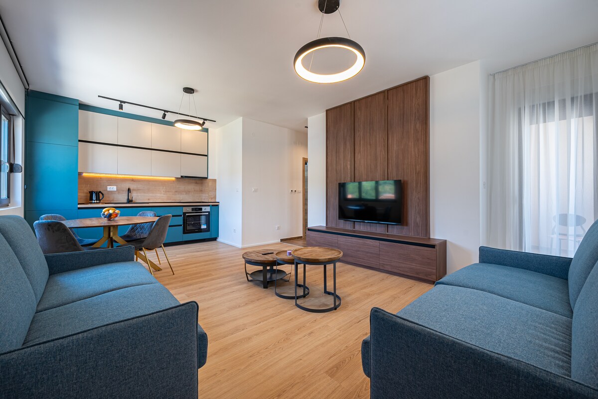 Completely new apartment, 70 square meters of luxurious and comfortable space specially designed for our guests. The apartment is located in the Modern Mountain II building, which was built in 2022 and exudes an elegant exterior, which is easily noticed in Boska Rasovica Street, a few minutes walk from the city center and 9 kilometers from the Bjelasica Ski Center. The apartment is equipped with high quality elements.