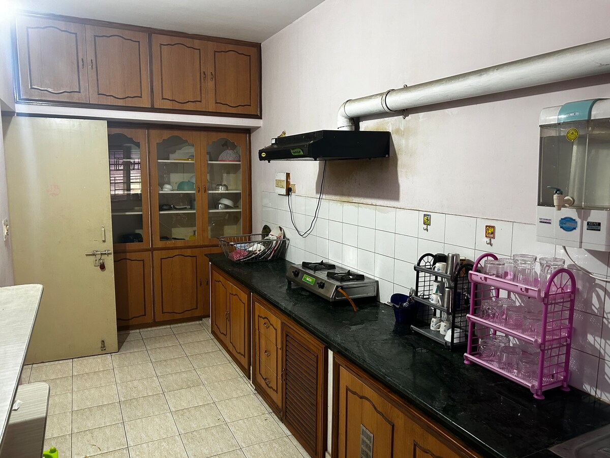 Bring the whole family to this great place with lots of room for short or long stay. A traditional and well equipped house with care taker available in prime location. The house has all amenities and fully furnished. Free parking, terrace, apart from the spacious bedrooms with AC. A living room and separate dining room with spacious equipped kitchen for your self service. More than 6 guests charge of 500/- per day extra.