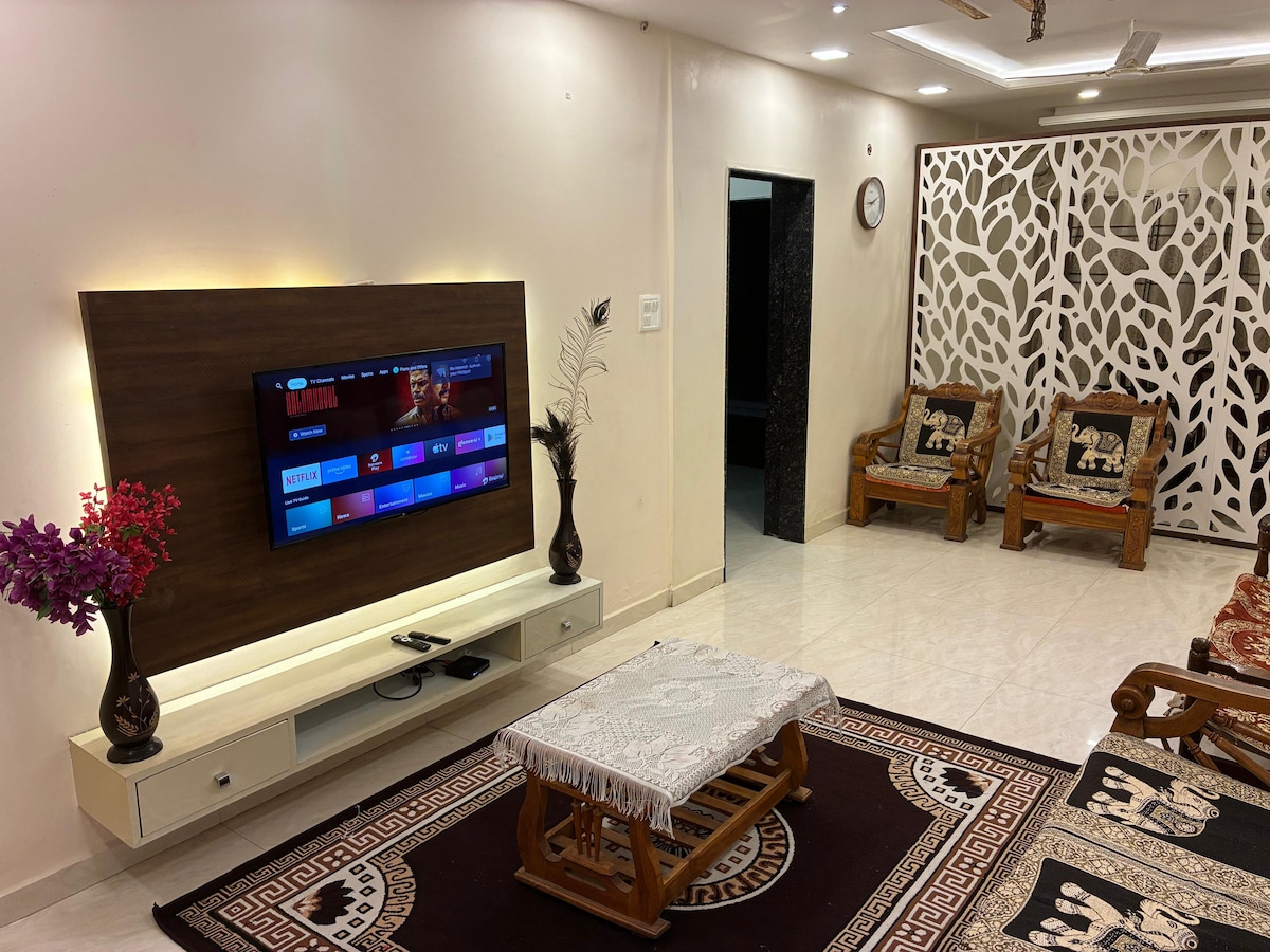 Mirje’s Deck is a cosy & luxurious 3 Bedroom with 2 attached bathrooms, in the heart of Kolhapur, designed for families and groups seeking comfort and peace. Enjoy elegant bedrooms, modern baths, AC, Wi-Fi, and Tata Sky HD. Cook your favourites in the fully equipped kitchen, then unwind on two serene outdoor decks—sip coffee at sunrise or relax under sunset skies. A perfect blend of luxury, warmth, nature, and style for your Kolhapur stay.