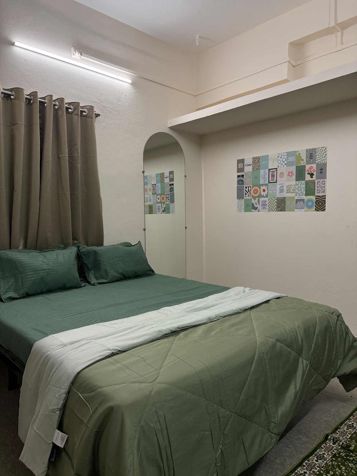 Drift into deep rest in a cozy bedroom that blends modern textures with soft lighting. Featuring a luxurious queen-sized bed with an upholstered headboard, a sleek full-length mirror, ambient pendant lights, and a serene circular wall niche, the space invites you to unplug and truly unwind. Whether you're reading under the warm glow of the pendant lights or waking up to a sunlit room, comfort meets aesthetics in every detail. The in-room AC and fan ensure a pleasant stay through all seasons.