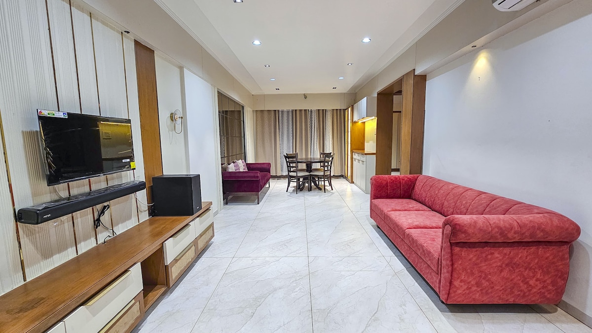 Located 5 mins away from train station and central bus stand of Kolhapur. This Luxurious apartment offers posh interiors comprising of 2 ensuite rooms + Sofa-cum-Bed and extra bedding for additional 4 people. Expect a fully functional Kitchen however Swiggy and Zomato are pretty much available. The airy space located amidst residential hub on 4th floor in the heart of the city. The elevator's right outside easily accessible. This apartment is available only for families.