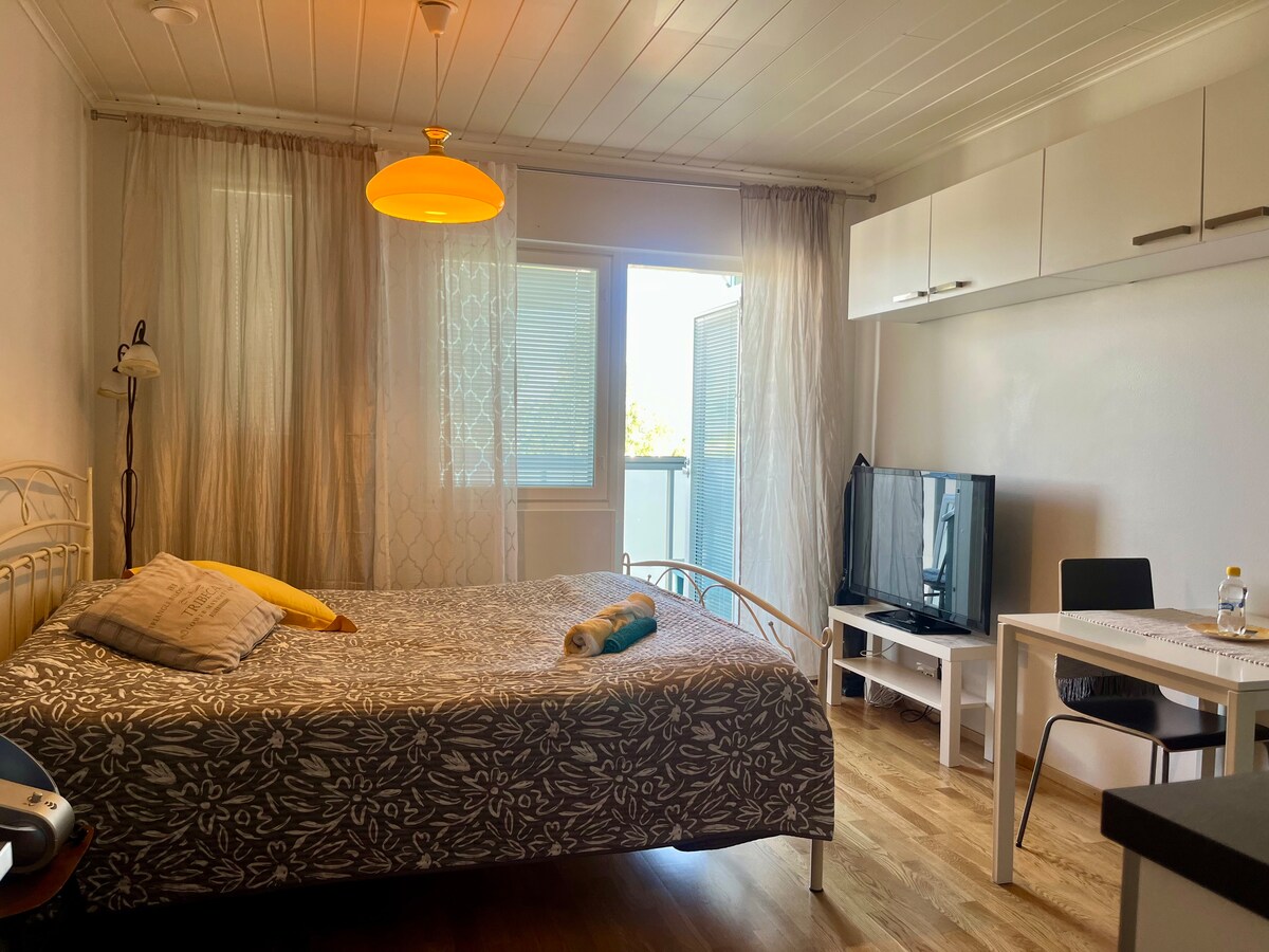 A cozy, 35,5 square meter studio apartment located in the city centre of Joensuu. The studio is in the second floor of a peaceful apartment building. There's a parking spot and an elevator. Bedlinen, towels, soap and shampoo, hair dryer, drying washing machine, kitchenware, dishwasher, refrigerator, microwave, oven and stove, coffee machine, kettle, toaster, a 43-inch smart-tv and WI-FI are included. For toddlers there's a travel crib and toys.