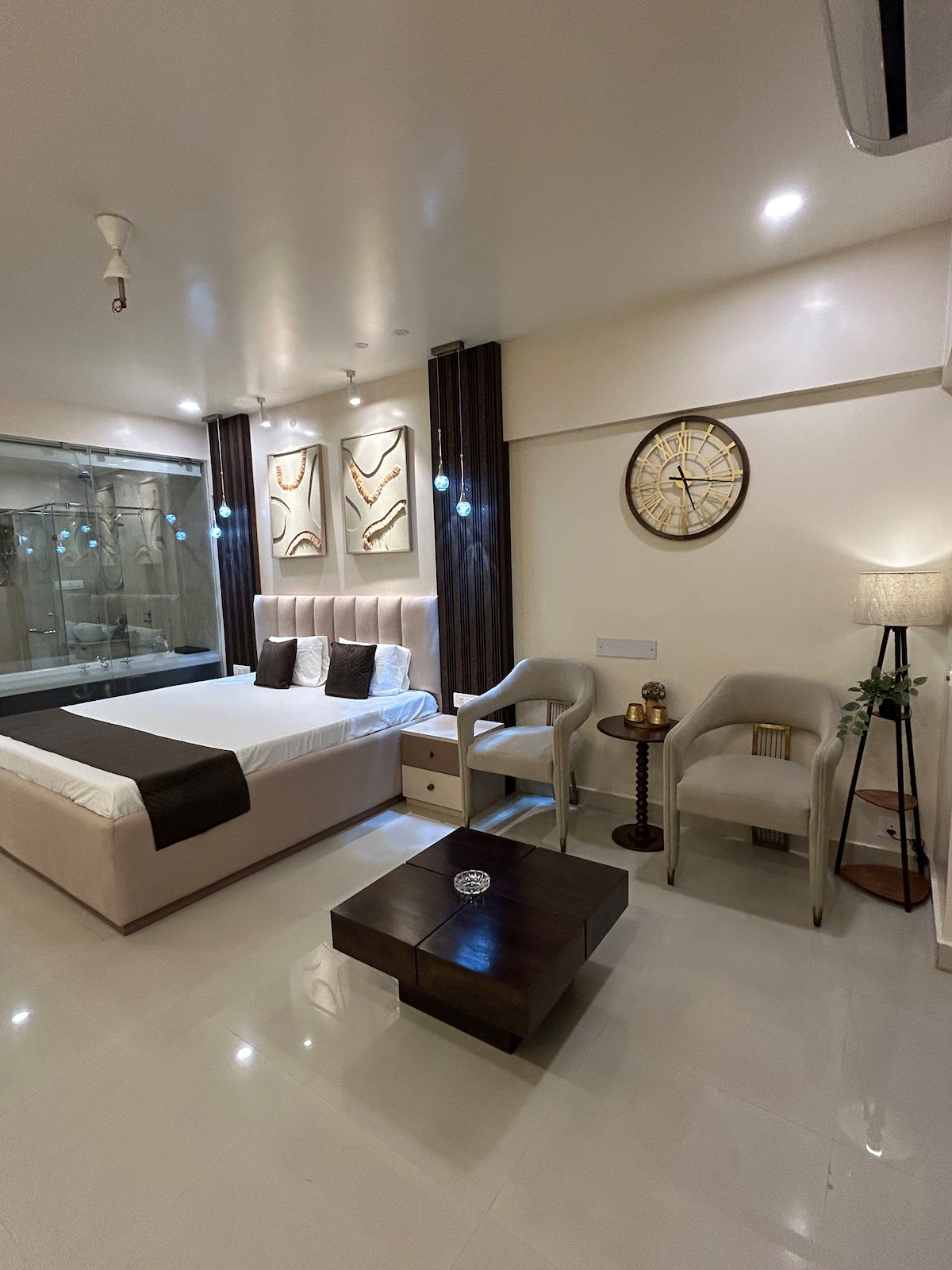 The Premium Luxory Apartment is unique, posh and luxurious. With two balconies, a swing, huge TV lounge, modern kitchen & unique luxorious double bath tub, the apartment is a haven meant for a perfect romantic holiday getaway. We offer customised 'Yoga & Meditation' - The lifestyle magic from the East, harmonizing the mind, body, and spirit for a better living. The rejuvenating therapy is taught by trained yoga practitioners, available with a nominal fee of INR 2000/- per person per hour.