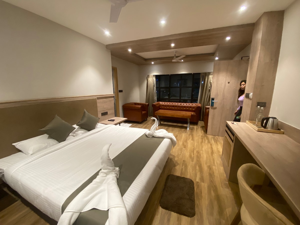 Welcome to your modern premium stay – a spacious, well-furnished deluxe room designed for both couples and families looking for comfort, class, and convenience. Enjoy a large premium bed with cozy mattress & fresh linens, paired with a plush sofa for ultimate relaxation. Stylish interiors with a spacious, hygienic, and clean environment Private attached bathroom with modern fittings Bright and airy room, perfect for a relaxing stay Daily housekeeping and excellent room service (our USP!)