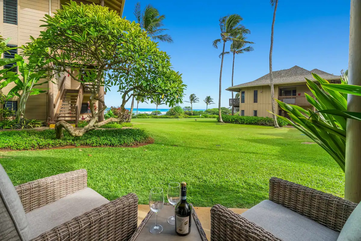 This amazing bright and open condo in is sure to make your vacation fantastic! The perfect place for couples and small families to enjoy the amazing island of Kauai. Enjoy coffee or dinner on the covered lanai with gorgeous ocean views. This centrally located condo is beachfront (5 minute walk)and within walking distance to the luxurious amenities offered the athletic club pool and gym, restaurants, coffee local shops. All costs, fees and taxes are included here in Airbnb!