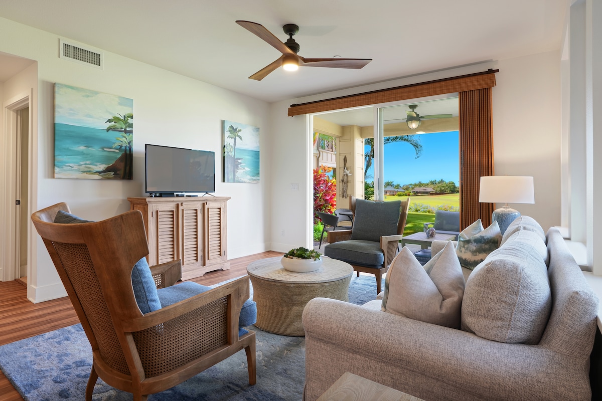Ground-floor condo in Building 26 at Kiahuna Plantation with partial ocean views and a serene garden lanai. Just a 2-minute walk to Kiahuna Beach and 10 minutes to Poipu Beach. Features A/C in the living room and bedroom, glass-free jalousie windows for Kauai’s trade winds, beach gear, parking, and full access to the Poipu Athletic Club, including pool and fitness amenities.