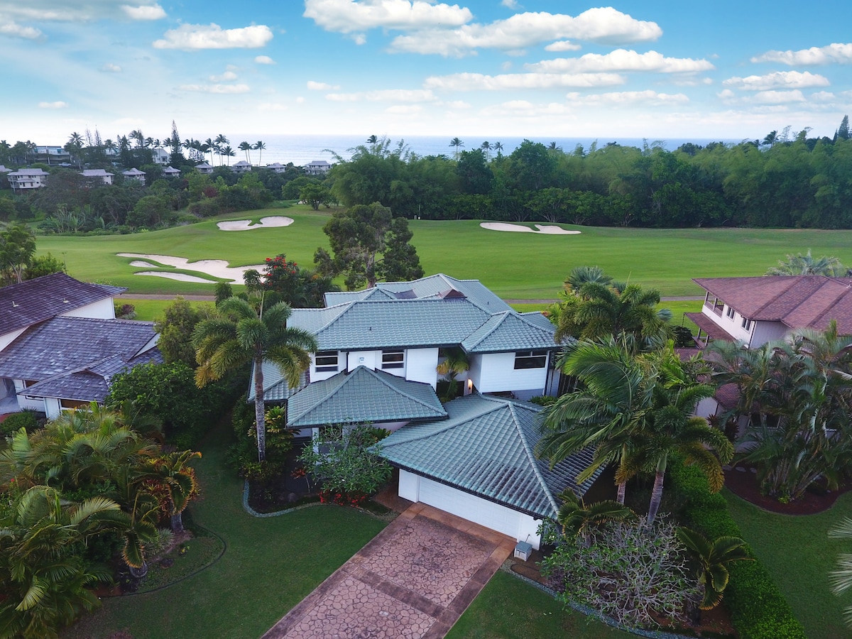 From the minute you walk into this spacious 3 bedroom, 2.5 bathroom bright and airy home, you will feel instantly relaxed. Private lanais off two of the three bedrooms and a lanai off the kitchen with mountain and ocean views provide an indoor/outdoor feel to this home. There is AC in 2 of the the 3 bedrooms. A bench in the backyard offers sunset views of the Hanalei sunset overlooking the golf course. Walk five minutes to nearby Happy Talk restaurant for one of the best mai tai's on island.