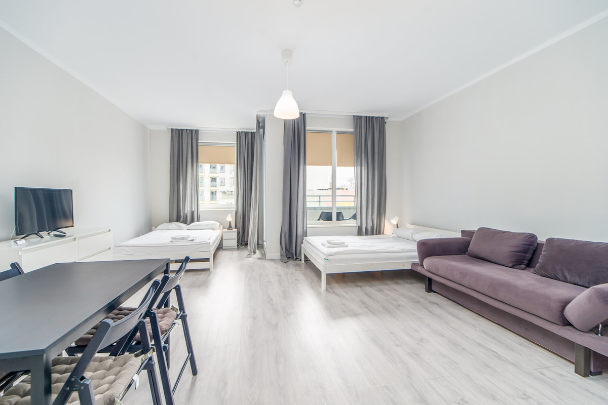 Apartament z prywatną sauną fińską, balkonem. Jasny, pięknie wykończony! Posiada wydzieloną sypialnię z dużym wygodnym łóżkiem, szafą i TV. W salonie- komfortowa rozkładana duża sofa, stół. Aneks kuchenny wyposażony jest w m.in.: zmywarkę, kuchenkę mikrofalową, indukcyjną płytę grzewczą, zlew, czajnik elektryczny, ciśnieniowy ekspres do kawy z młynkiem, opiekacz/toster, naczynia i sztućce. W łazience: prysznic, pralka. W korytarzu: duża szafa na ubrania oraz mniejsza- na okrycia wierzchnie.