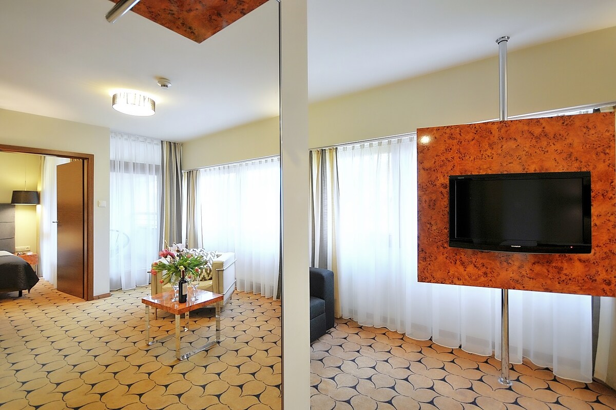 Apartament typu premium, znajduje się na trzecim piętrze budynku z windą i składa się z salonu z aneksem kuchennym oraz jadalni, sypialni, dodatkowej sypialni dla najmłodszych, łazienki i tarasu z panoramicznym widokiem na dziedziniec obiektu gdzie znajduje się basen zewnętrzny. Apartament przeznaczony dla maksymalnie 6 osób uwzględniając w tym pokój z łóżkami dla dzieci do 150 cm. W dniach od 12.11.-03.12. b.r. , cała strefa basenowa i wellness będzie nieczynna. Przerwa techniczna.